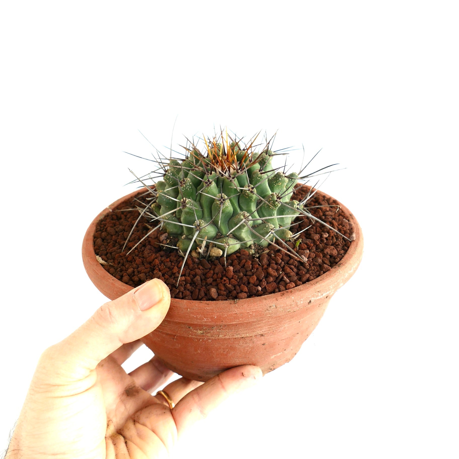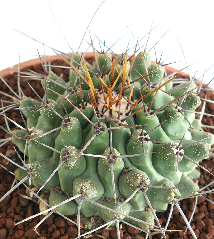 The Thelocactus rinconensis SELECTED SPECIMEN stands out with its dense, radial spines and vibrant blooms that appear seasonally. Its thick, rounded body stores water efficiently, making it resilient in arid conditions. Also known as Rincon cactus, this species features a greenish body contrasted by white and brown spines. Its ornamental appeal suits both indoor and outdoor succulent enthusiasts.