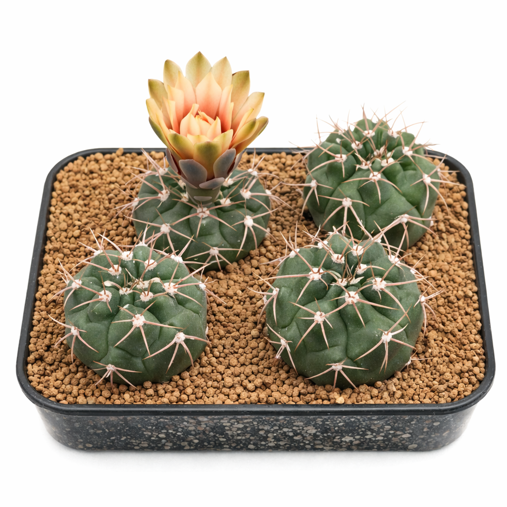 ジムノカリキウム・シゲリアナムは、サボテンの上部近くに咲く魅力的な花をつけます。その控えめな色合いは淡いピンクから白色まで広がり、濃い緑色のサボテン本体との優しい対比を生み出します。この植物は、その希少性と美しい外観からコレクター向けサボテンとして人気があります。さらに、このアルゼンチン・サボテンは整ったコンパクトな成長パターンを示し、小さな庭園や室内コレクションに適しています。