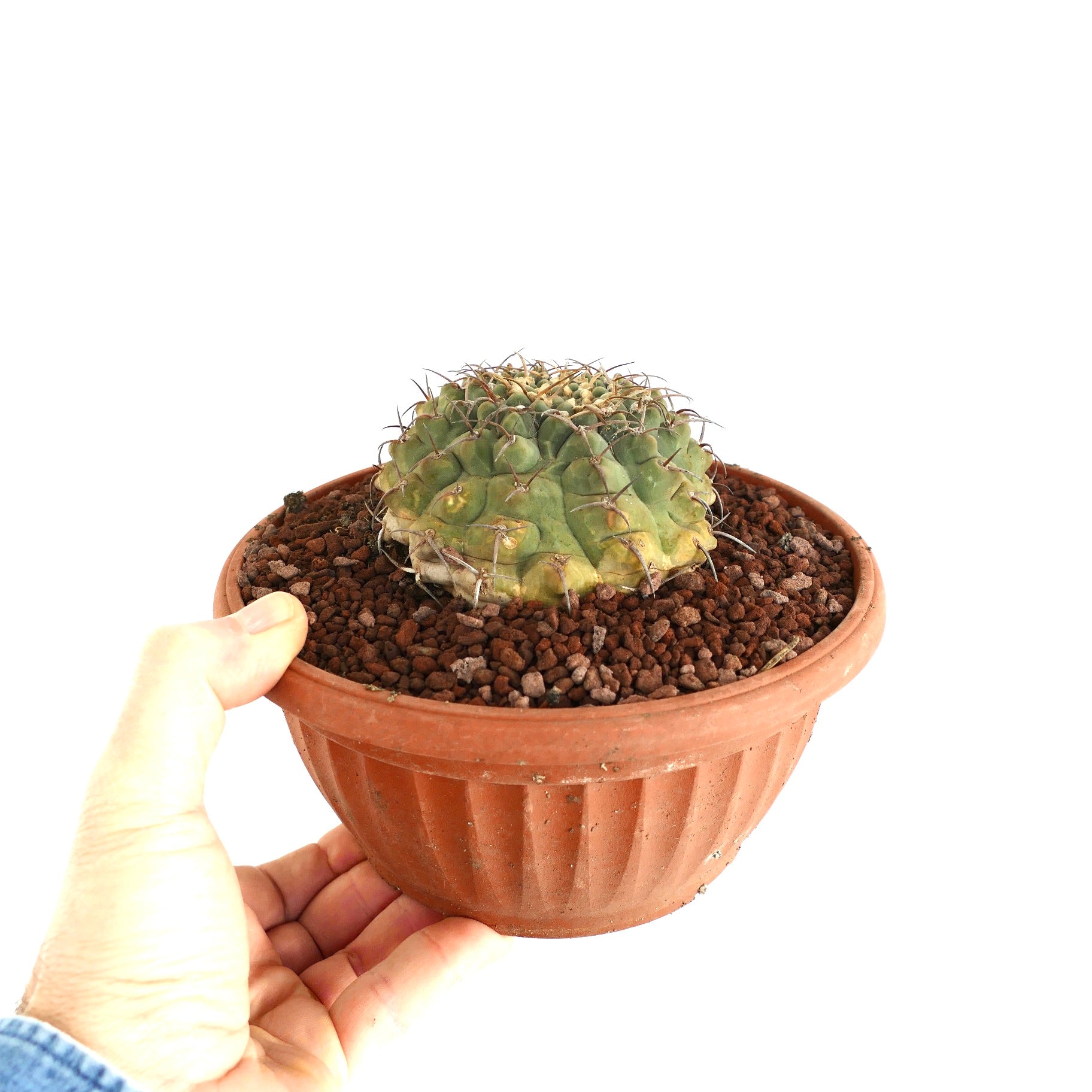The Gymnocalycium vatteri BIG OLD PLANT exhibits thick, fleshy stems that support its longevity and impressive growth. The plant’s spines are short but sturdy, providing a unique ornamental appeal without overwhelming its overall form. This Argentine cactus shows subtle color variations in its green hues, adding depth to its visual character. Collectors prize the vatteri species for its rarity and distinctive morphology.