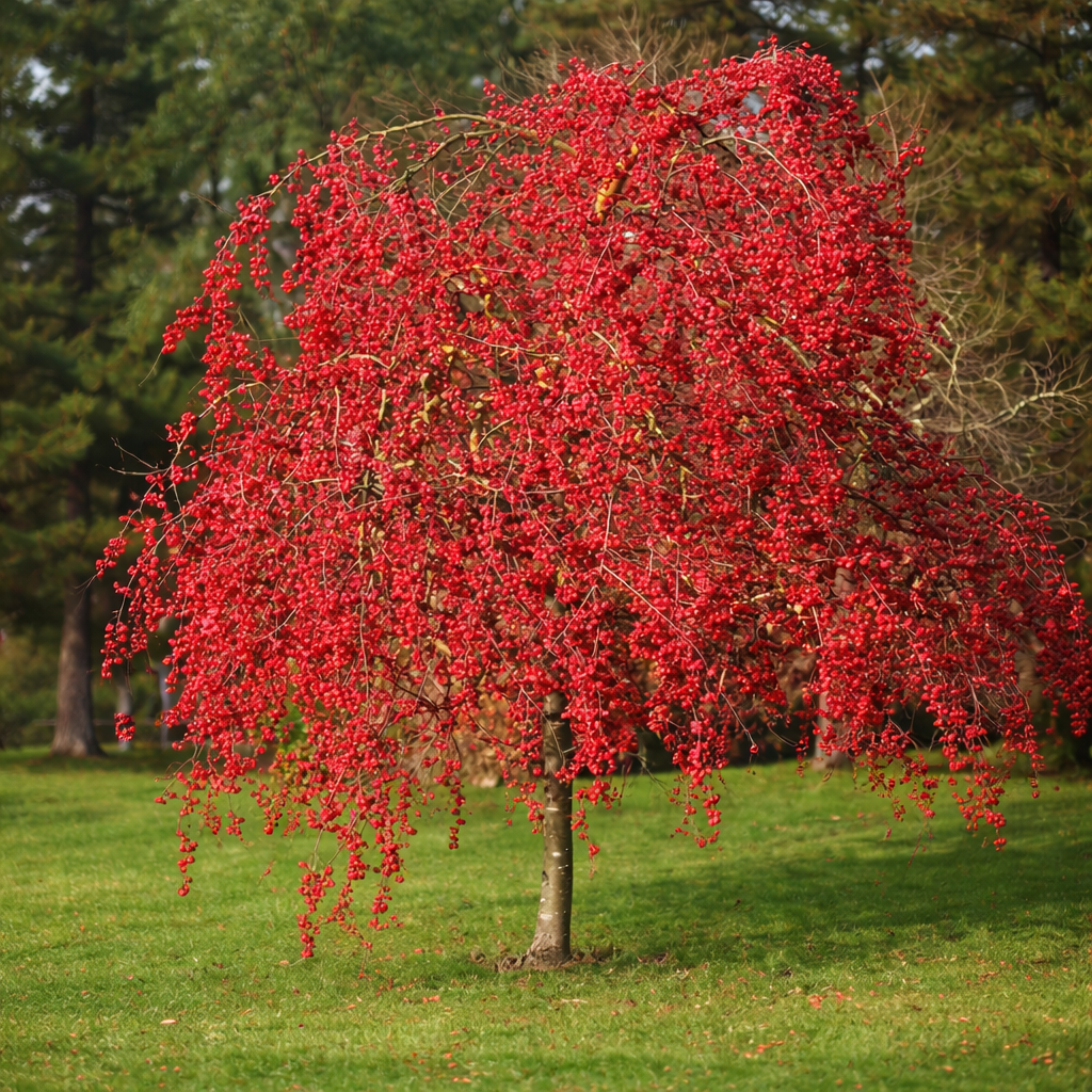 Malus cv. 'Red Sentinel'は、その鮮やかな赤い実と優雅な姿で愛される美しい観賞用のクラブアップルです。このマルスの園芸品種は、コンパクトで直立した樹形を特徴としており、庭園や景観に垂直的なアクセントを加えます。小さく光沢のある緑色の葉は、秋から冬にかけて長く残る鮮やかな赤い実を美しく引き立てます。ガーデナーは、多季節にわたる装飾的な魅力を評価しています。