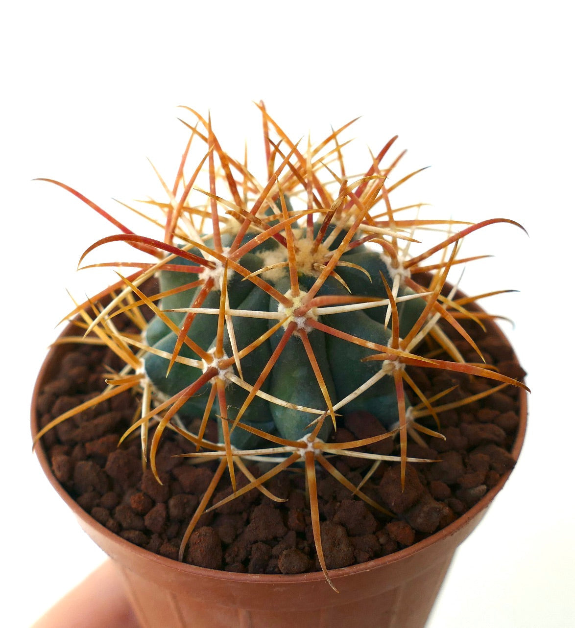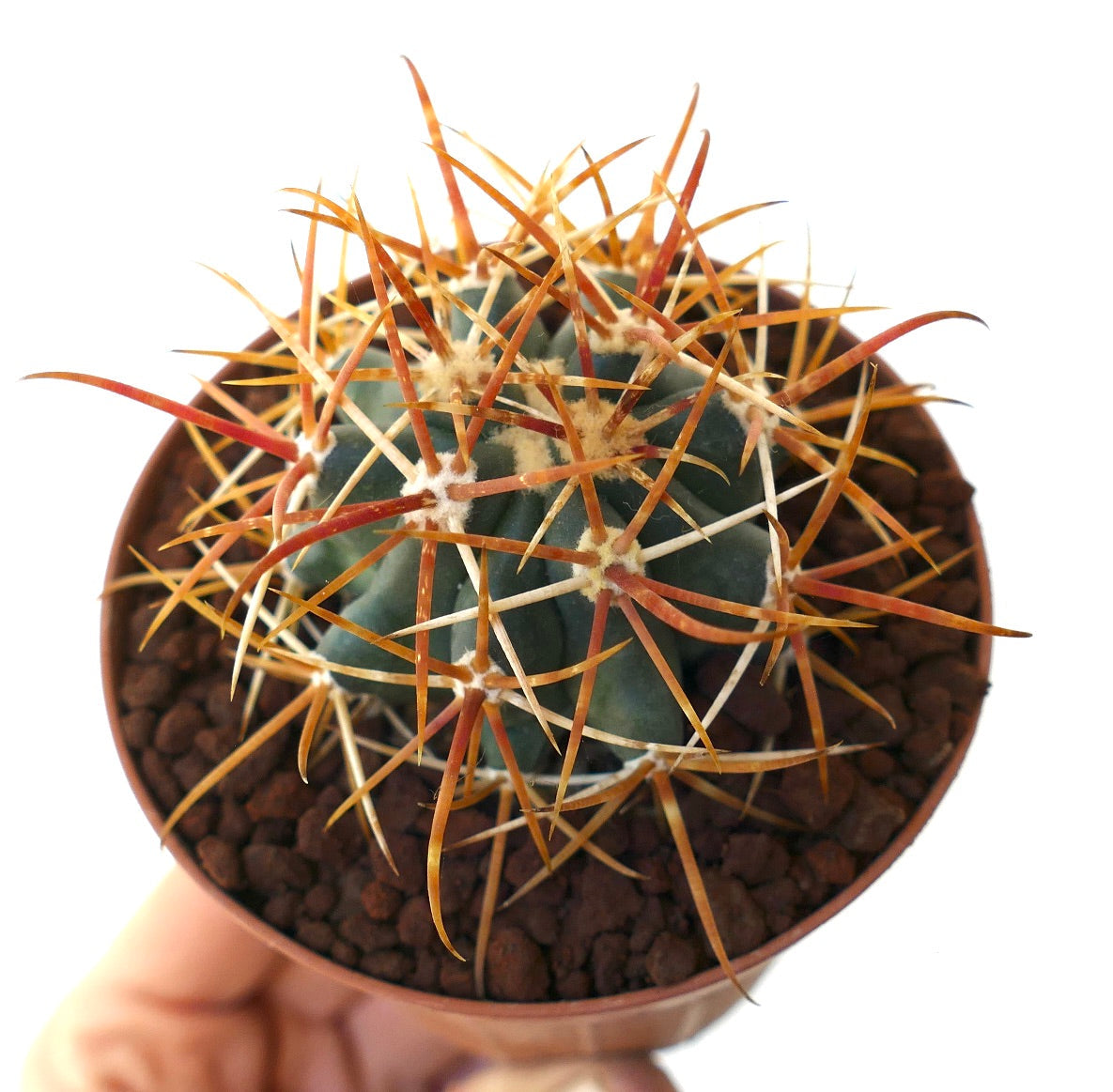 Ferocactus chrysacanthus is a striking desert cactus admired for its bold appearance. This unique specimen features fiery red-orange spines that set it apart from typical golden-spined Ferocactus. Collectors prize this Mexican cactus for its vibrant coloration and robust form, which adds a dramatic touch to any collection. The intense colors truly highlight the natural beauty of this ornamental cactus.