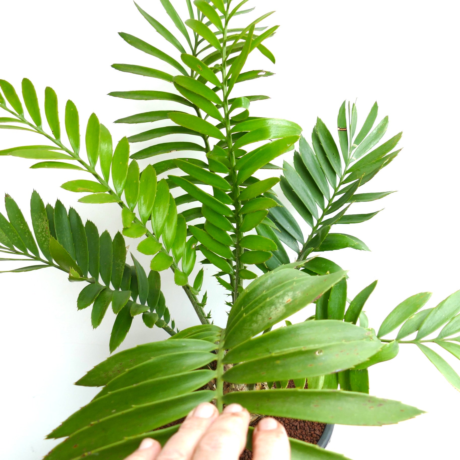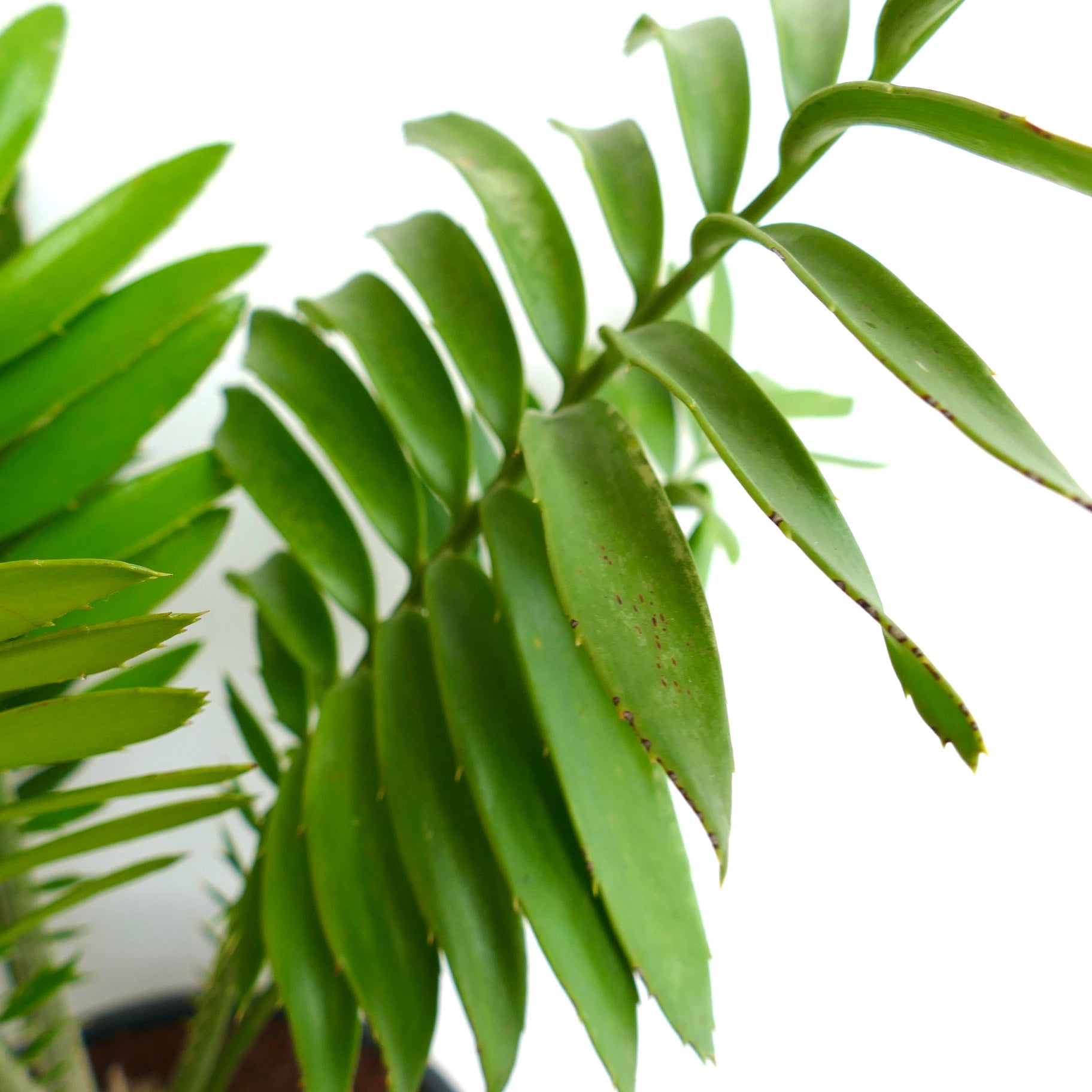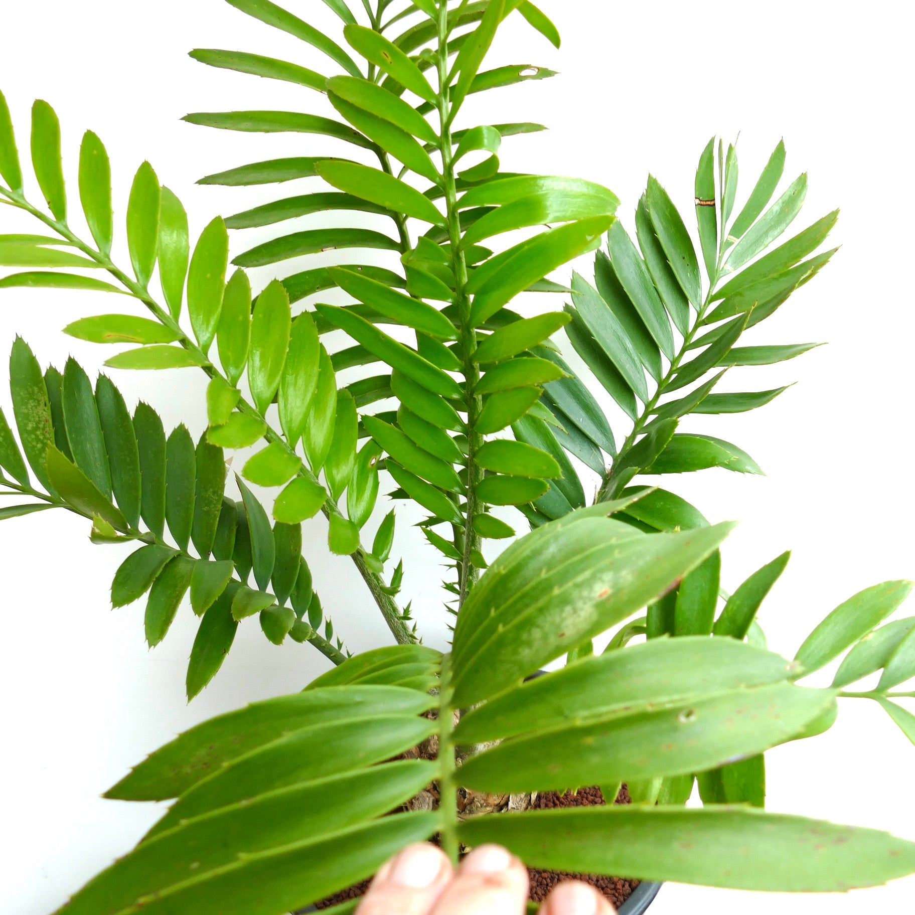 The foliage of Encephalartos ferox X sclavoi blends the broad strength of ferox with the refined symmetry of sclavoi. New growth often emerges in a fresh bright green, then matures into a deep emerald tone with a leathery texture. The rigid leaves curve gracefully outward. However the edges remain armed with bold spines, adding a wild and sculptural character to the plant.