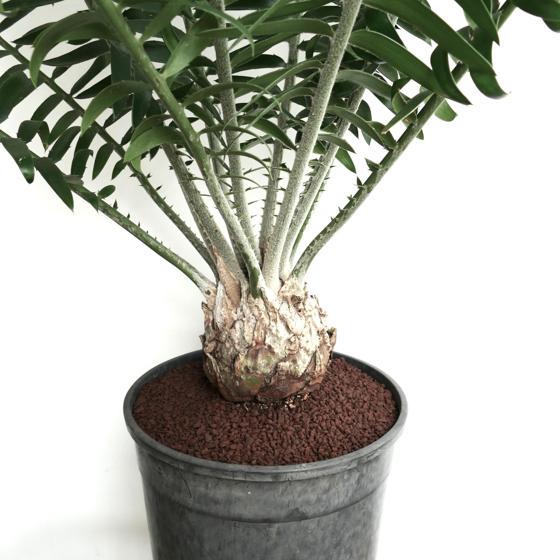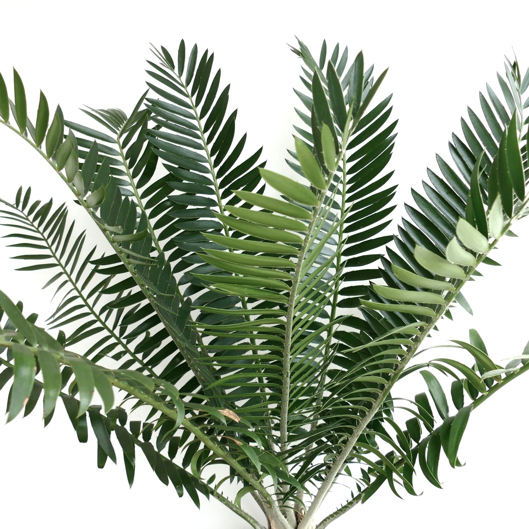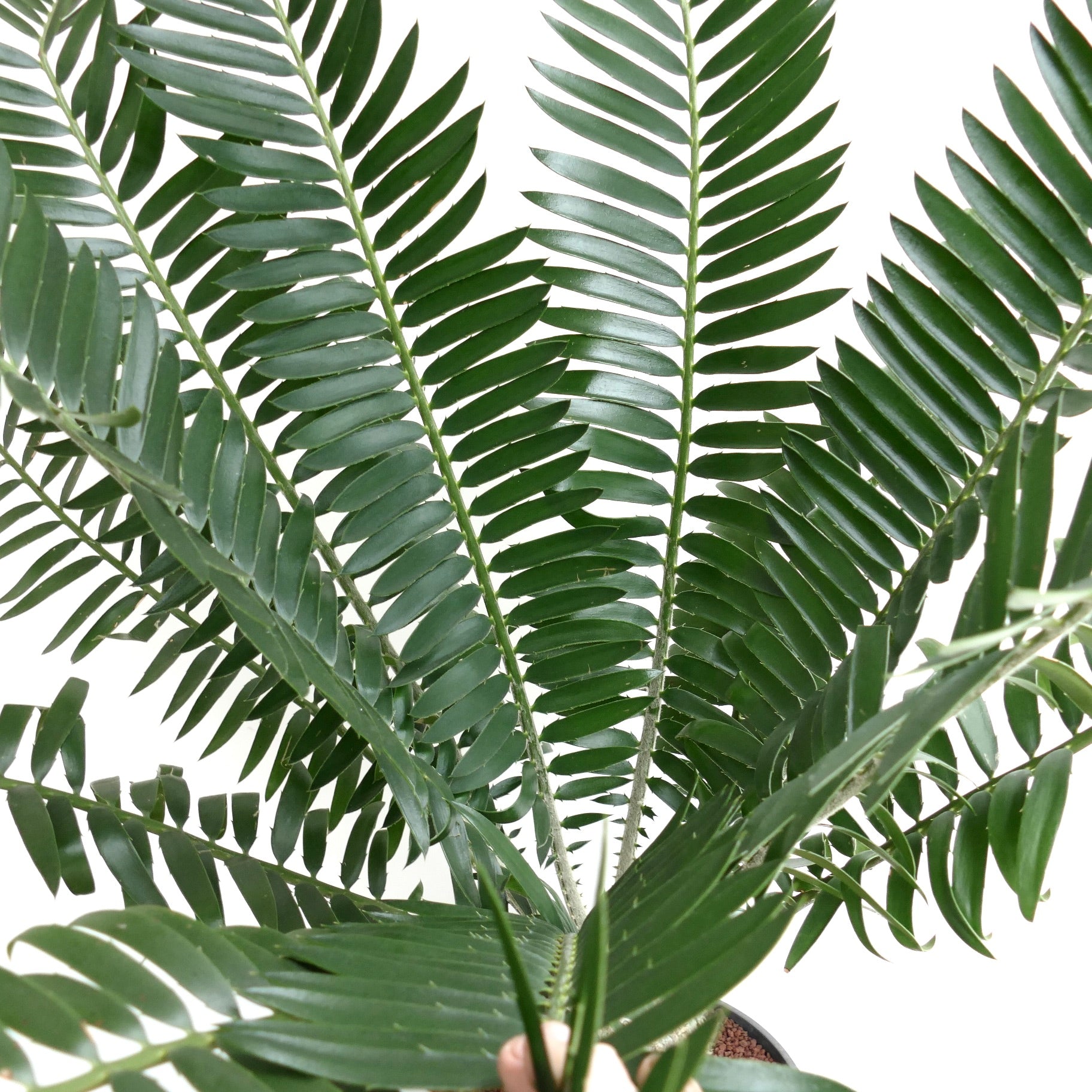 The foliage of Encephalartos manikensis shows a beautiful blue-green to silvery tone that intensifies under strong light. The leaflets feel firm and slightly glossy. They form a graceful curve that softens the plant’s robust structure. However the tips often display subtle spines, adding character without overpowering the design. This balance between strength and refinement defines its unique charm.