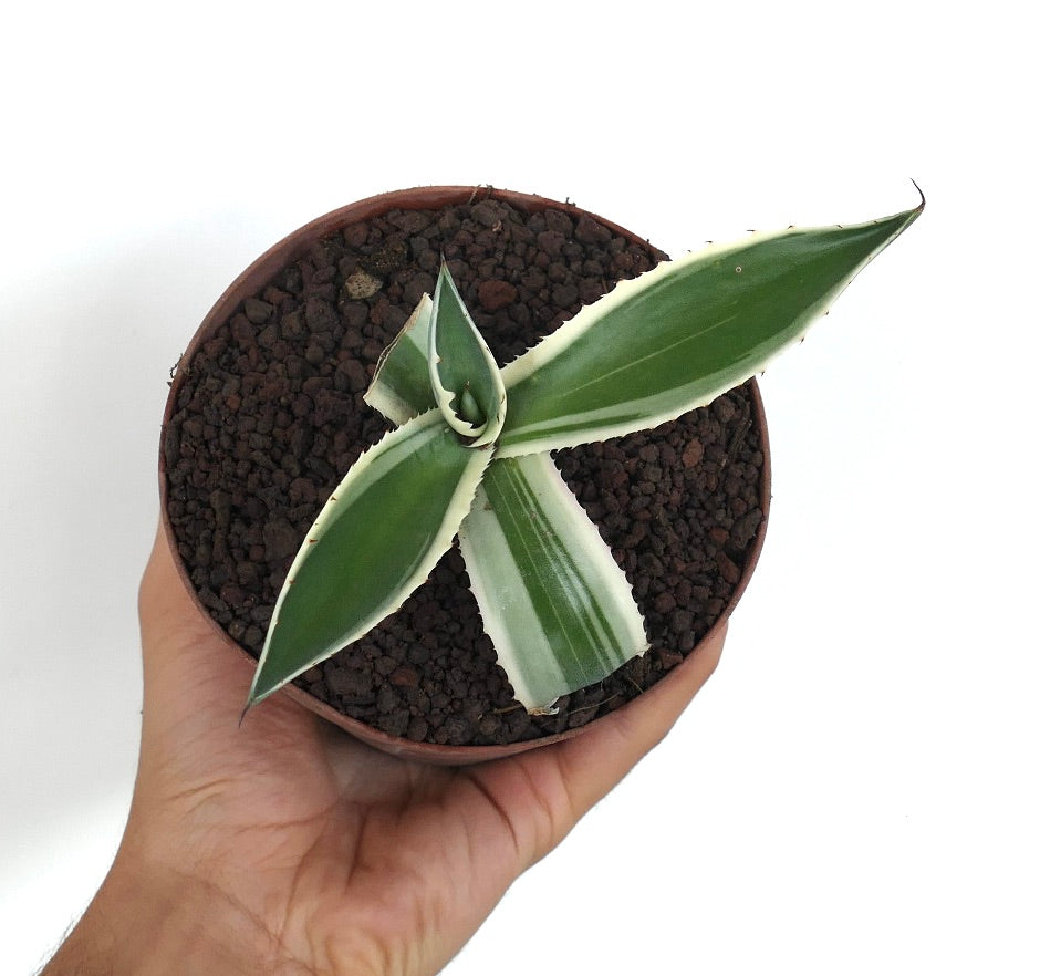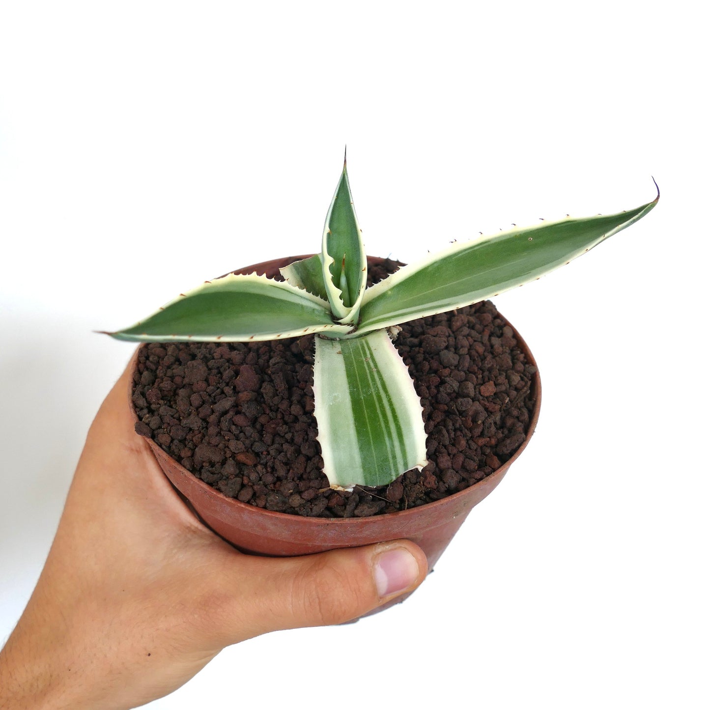 The Agave americana species is native to Mexico and thrives in dry, sunny environments. The White-yellow variegated Agave is especially prized for its ornamental value. Gardeners appreciate its architectural shape and unique color patterns. Its sharp leaf tips add an exotic, sculptural appeal. This plant is an excellent focal point due to its dramatic presence.
