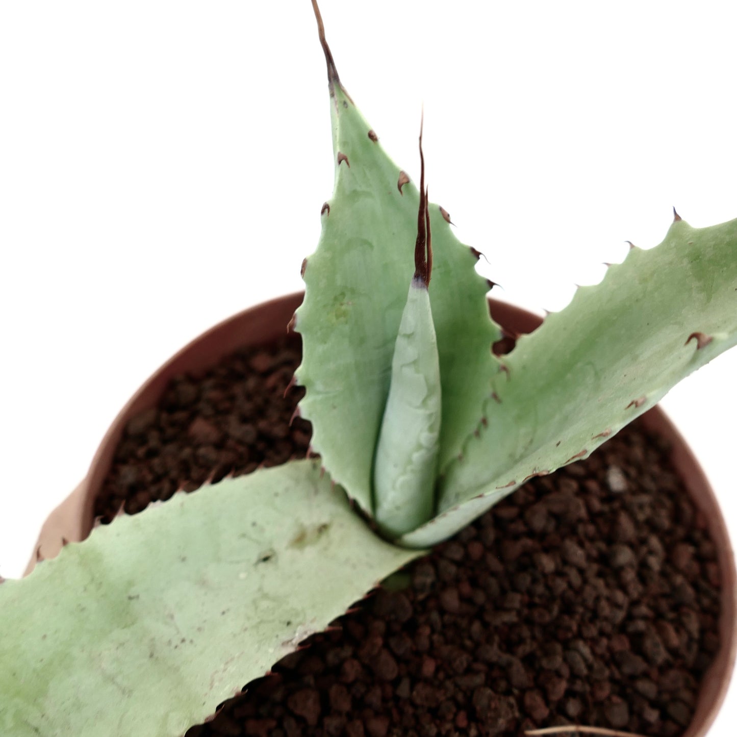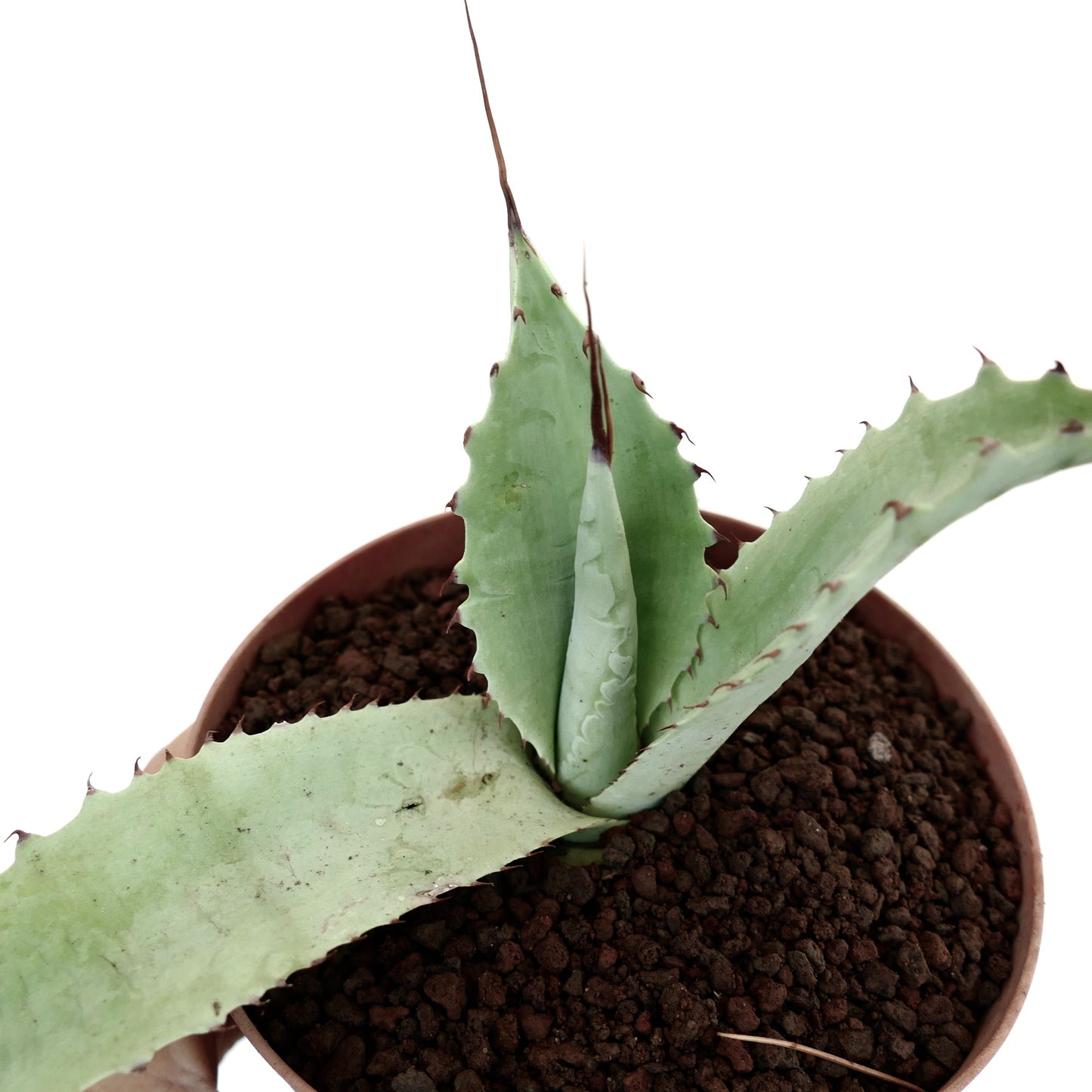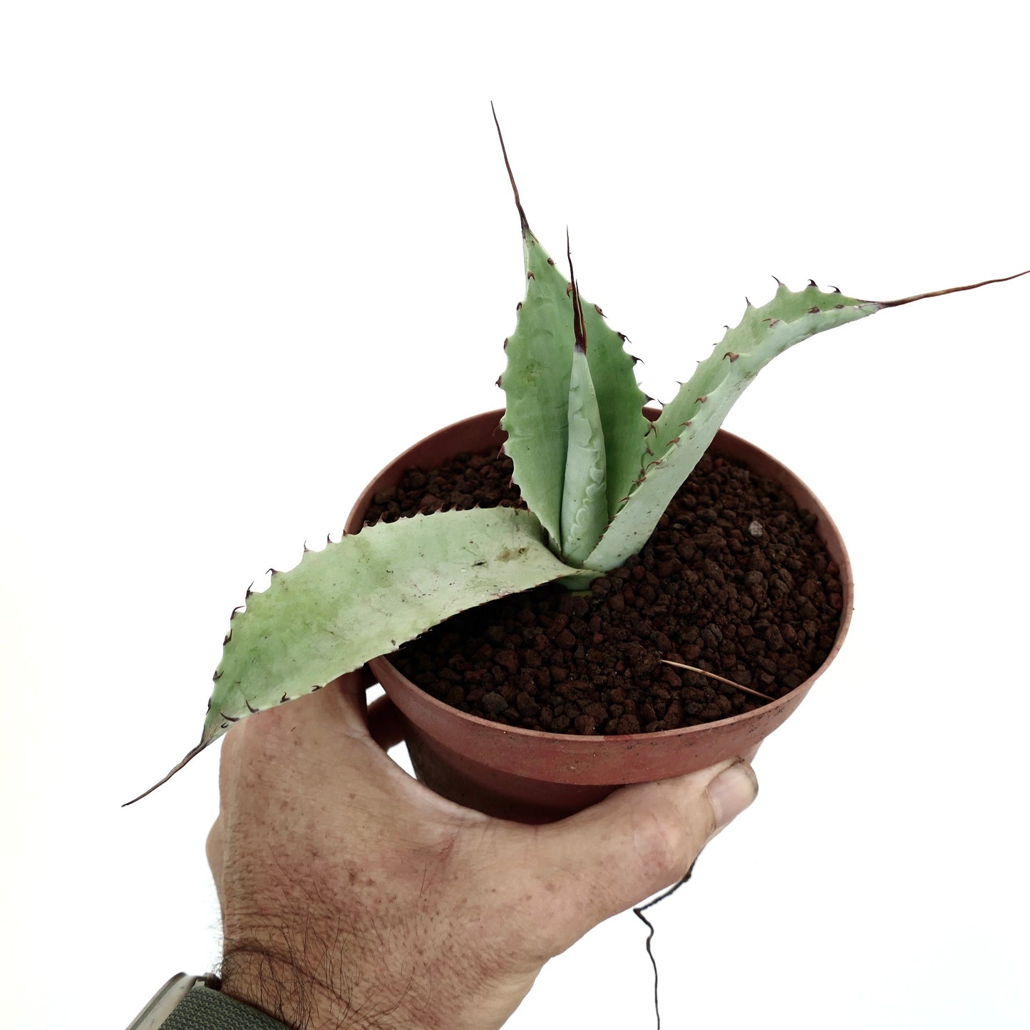 Agave cerulata X eborispina is a captivating hybrid agave renowned for its stunning rosette of blue-gray leaves. The leaves are elongated, thick, and rigid, featuring fine marginal teeth and a sharp terminal spine. This hybrid blends the elegant, slender leaves of A. cerulata with the densely toothed edges of A. erborispina, creating a striking visual effect. It can grow up to 3 feet tall and wide, making it a dramatic addition to any succulent garden or desert landscape. Known for its drought tolerance and resilience, this agave is perfect for xeriscaping and low-maintenance gardening.