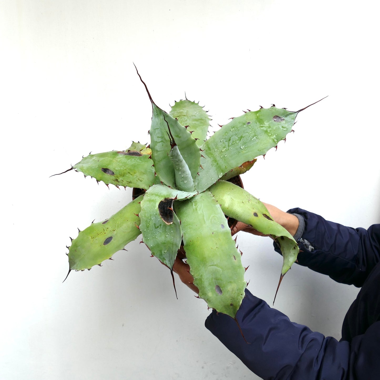 The Agave cerulata X eborispina X bovicornuta F3 showcases an impressive array of spines and margins, offering a dramatic silhouette. This hybrid agave thrives as a sculptural focal point, blending toughness with ornamental appeal. Its form is both architectural and natural, making it perfect for modern landscapes or specialized collections.