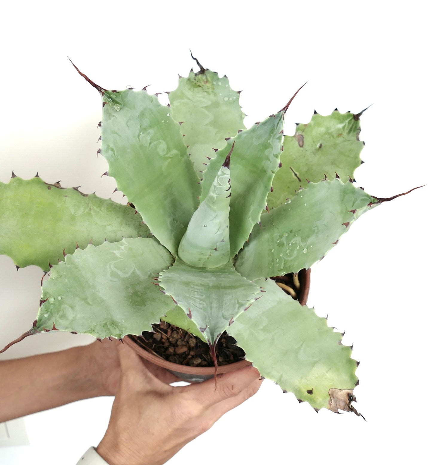 Agave cerulata X eborispina X ovatifolia is a complex hybrid succulent combining traits from all three parent species. It forms a rosette of thick, fleshy leaves that are typically blue-gray to greenish in color. The leaves are armed with prominent spines along the margins and a terminal spine. This hybrid can vary in leaf width and length, reflecting the diverse genetic influences. It is likely to produce a tall flowering spike with clusters of yellowish or greenish flowers. This plant is highly drought-tolerant and suitable for xeriscaping, making it a striking addition to any succulent collection.