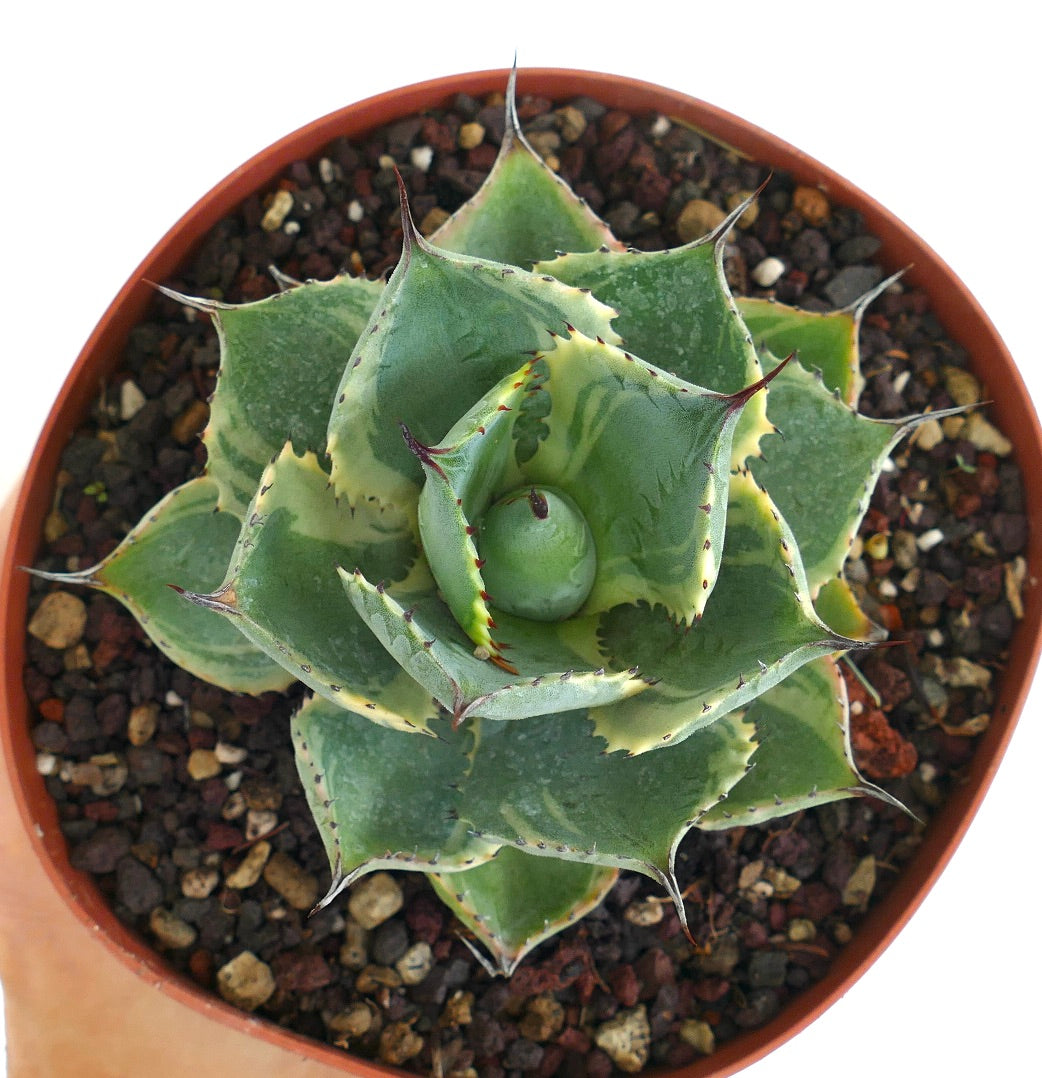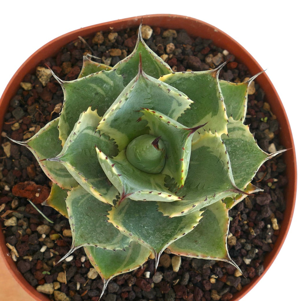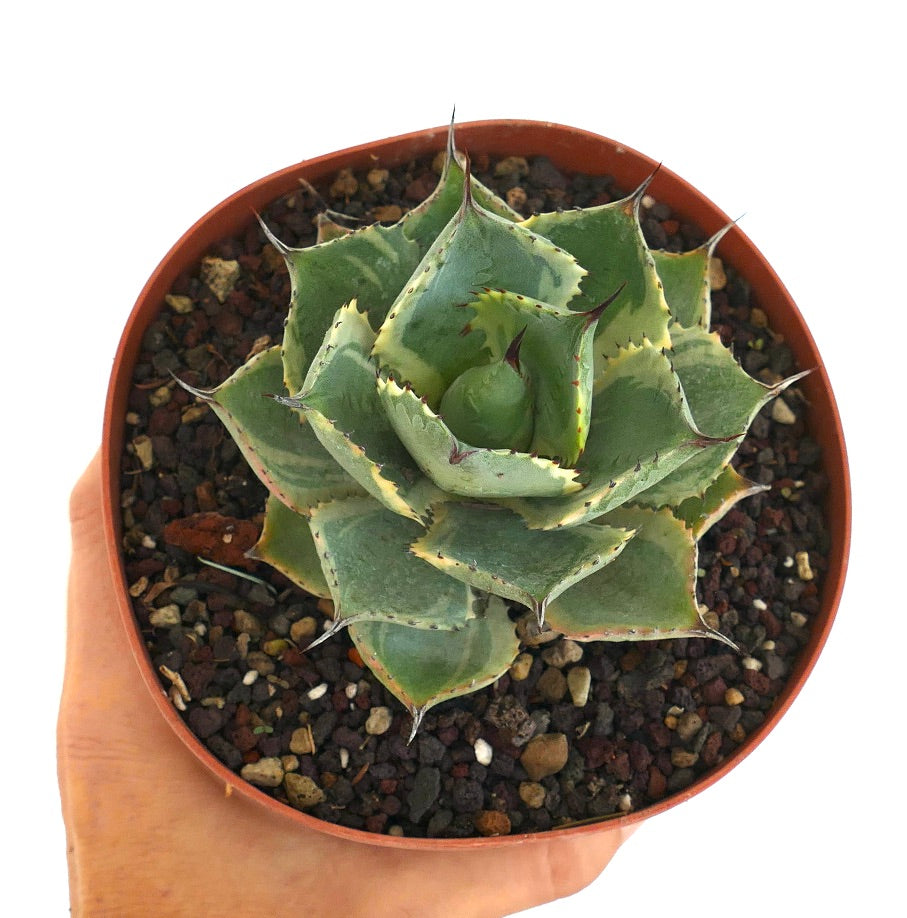 The Agave isthmensis cv. Delaware variegated is a stunning small agave cultivar known for its variegated foliage. The compact rosette is formed by thick, fleshy leaves, showcasing bold stripes of creamy yellow along the edges, contrasted with a bluish-green center. The leaves are armed with small, sharp spines along the margins and a prominent terminal spine at the tip. This drought-tolerant plant is both ornamental and functional, ideal for xeriscapes or container gardening. Its distinctive coloring and compact form make it highly sought after by collectors and gardeners alike.