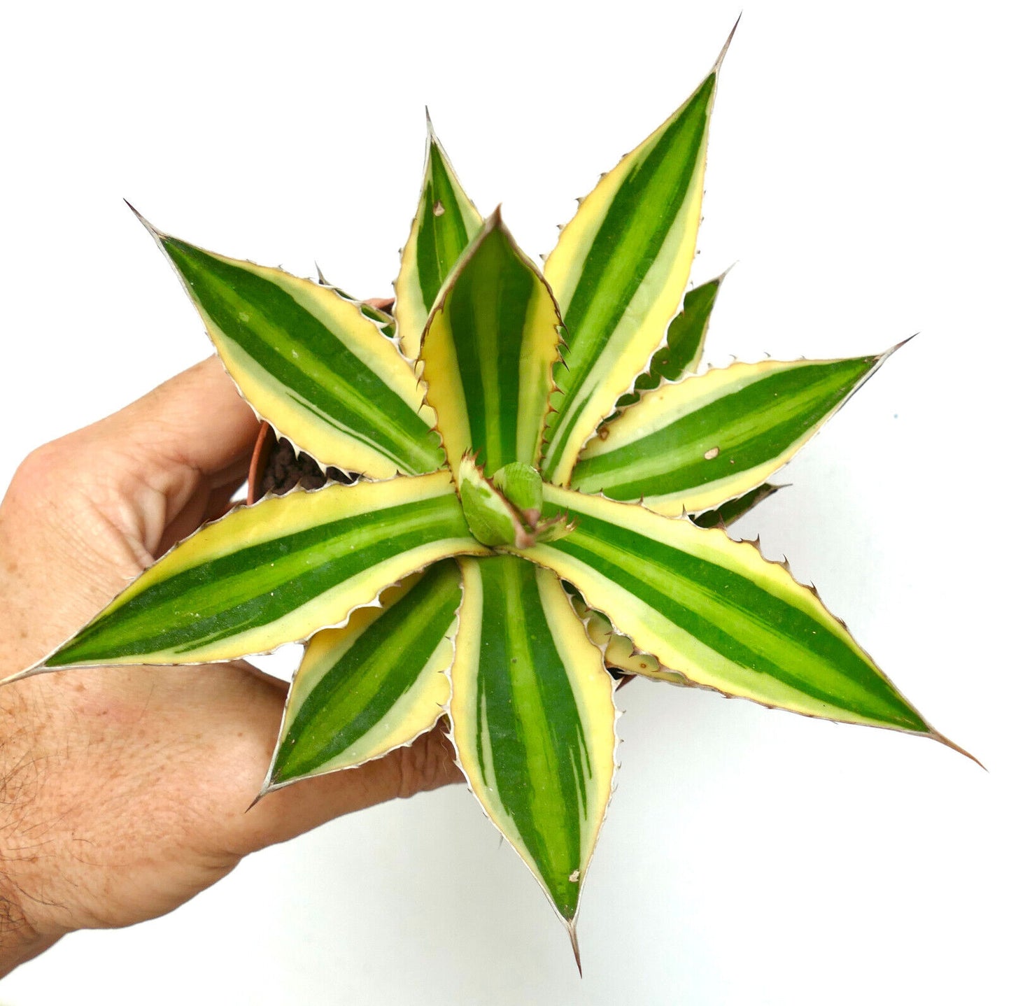 The Agave lophantha ‘Quadricolor’ VARIEGATED is a striking and compact succulent known for its vibrant and colorful foliage. This medium-sized rosette-forming plant reaches about 60 cm in height and width. Its sword-shaped leaves feature a stunning blend of green, yellow, cream, and red, creating a quadricolor effect. Each leaf is edged with small, sharp teeth and terminates in a pointed spine, adding to its dramatic appearance. In maturity, it may produce a tall flower stalk with greenish-yellow flowers. The Agave lophantha ‘Quadricolor’ is highly prized for its ornamental value and is perfect for adding a splash of color to gardens and landscapes.