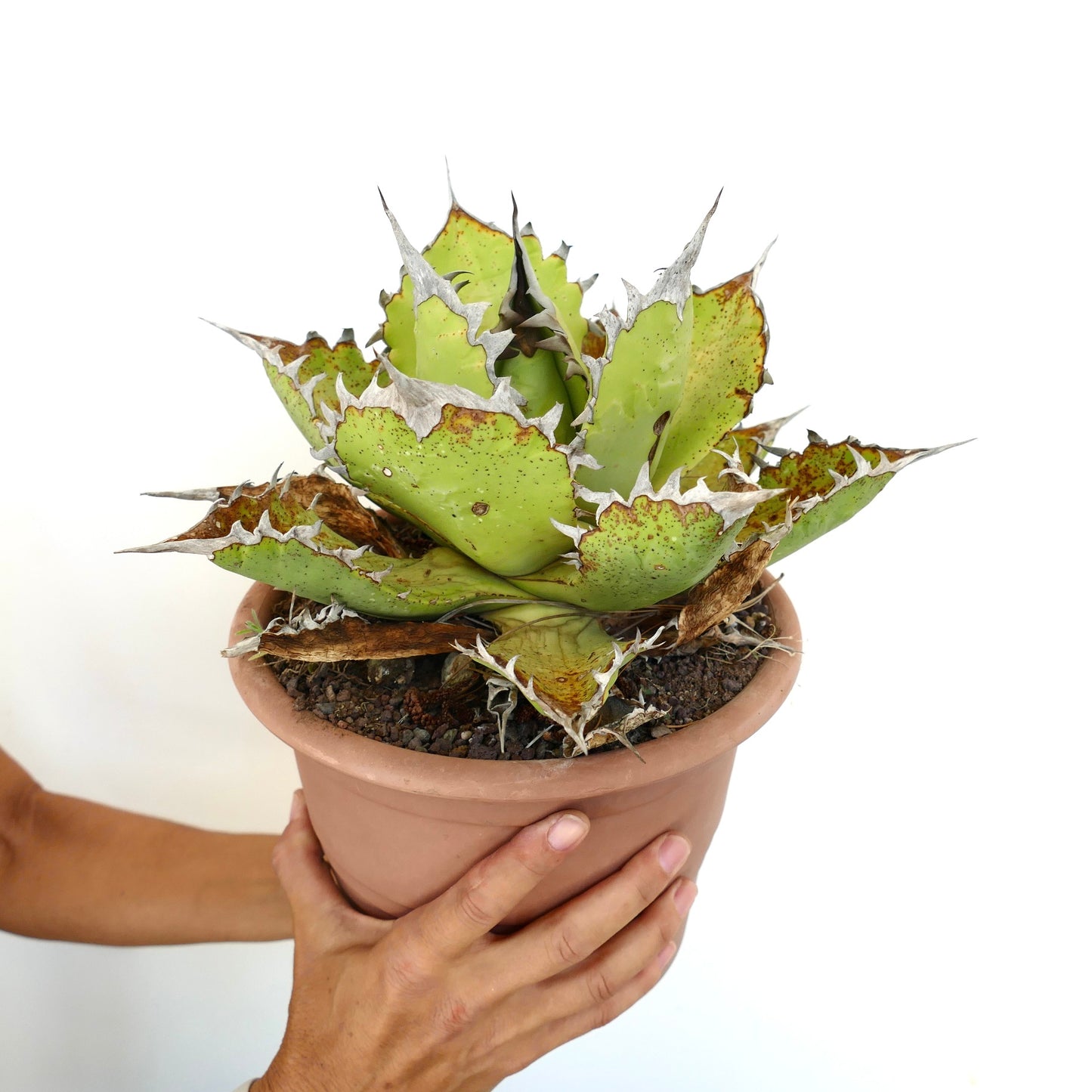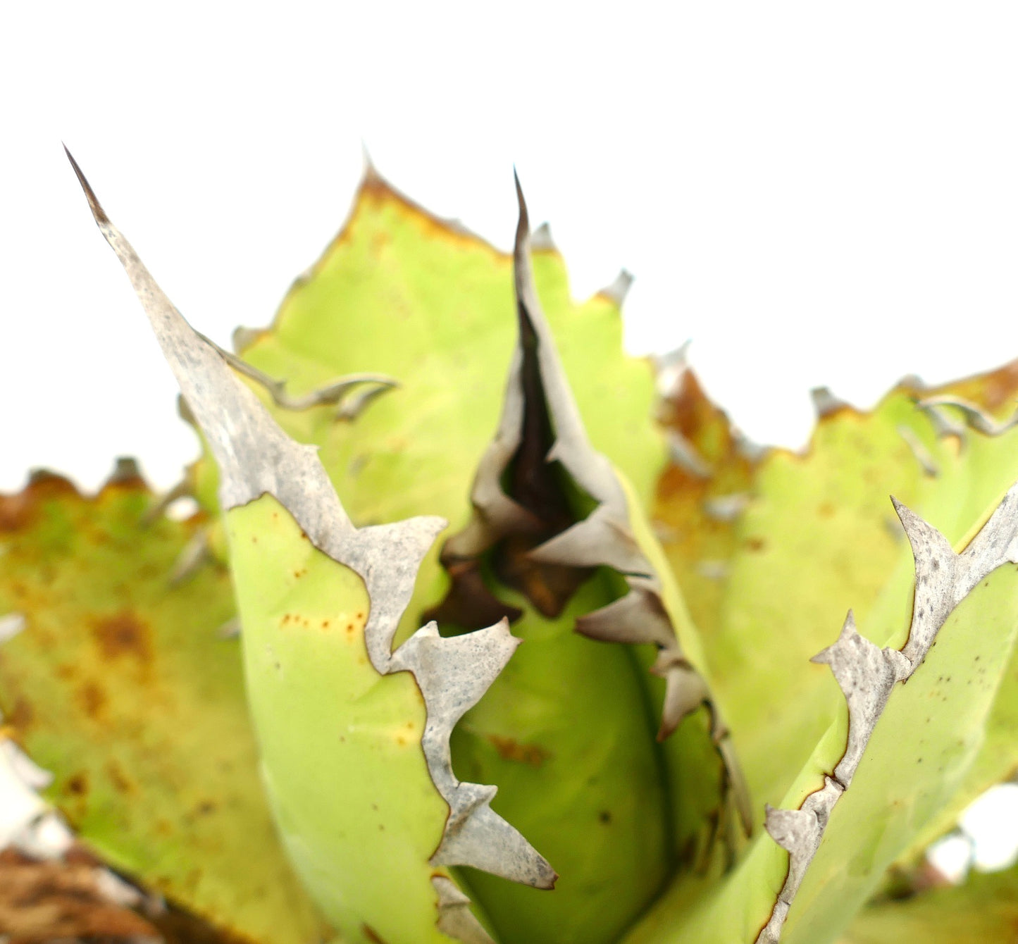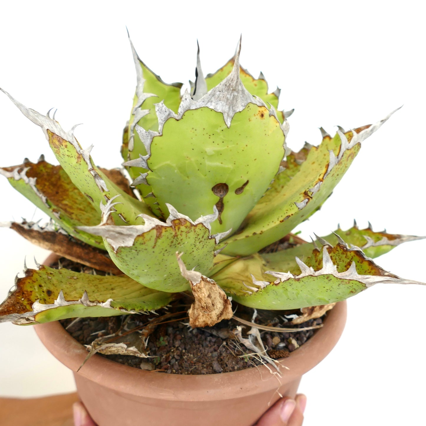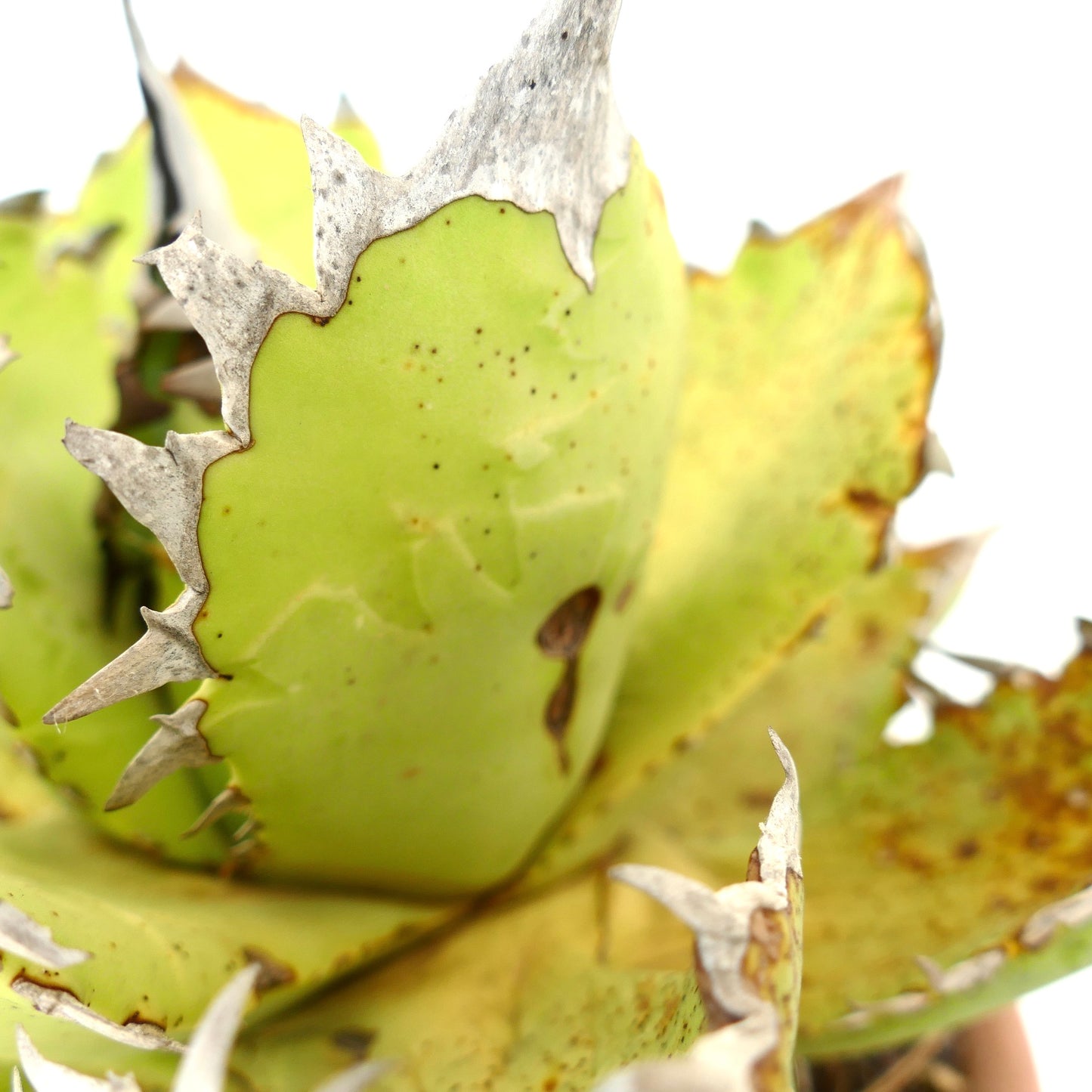 Agave oteroi is a striking succulent native to Mexico, known for its compact rosette of thick, fleshy leaves with sharp, prominent spines along the edges. The leaves are a blue-green color with distinctive impressions of neighboring leaves, adding to its visual appeal. At maturity, it produces a tall flowering stalk with yellow flowers. This agave's small size and symmetrical form make it a popular choice for rock gardens and containers.