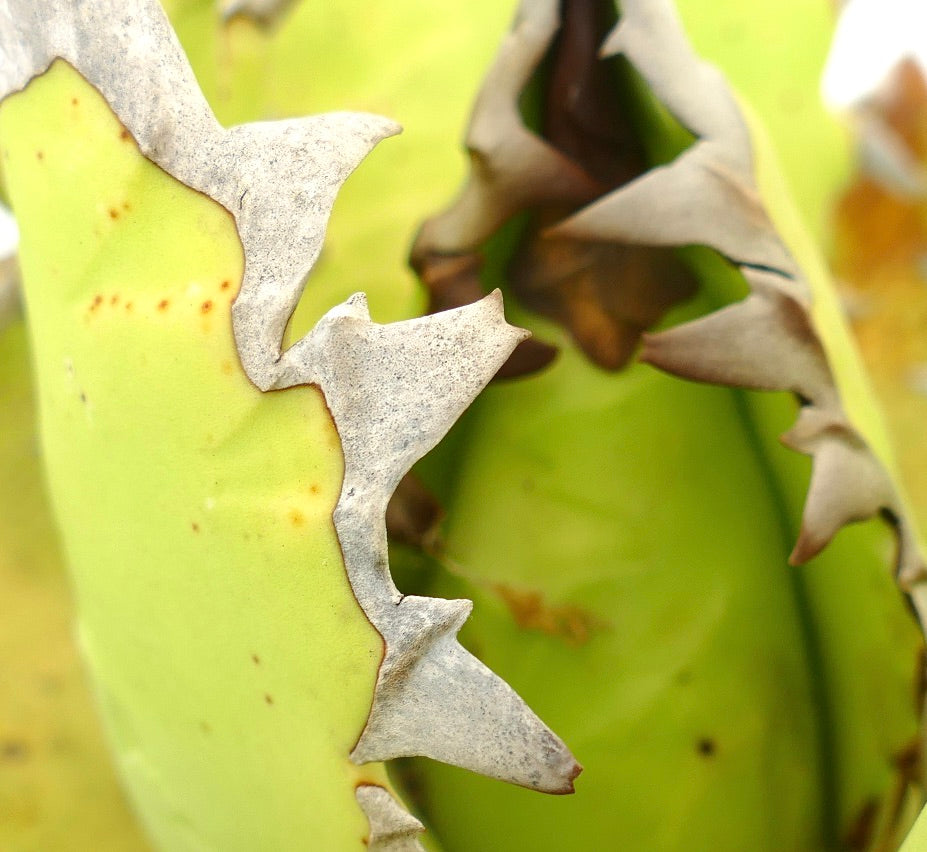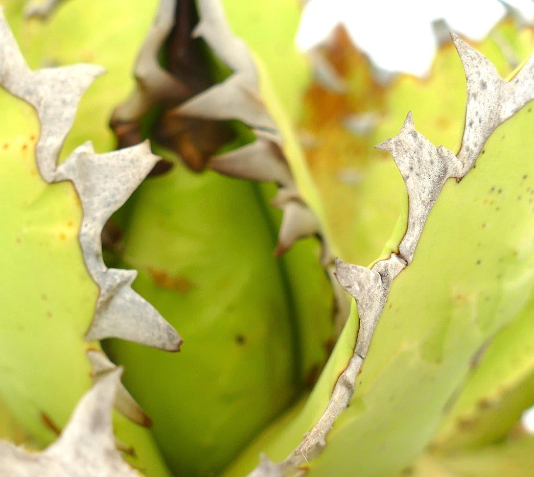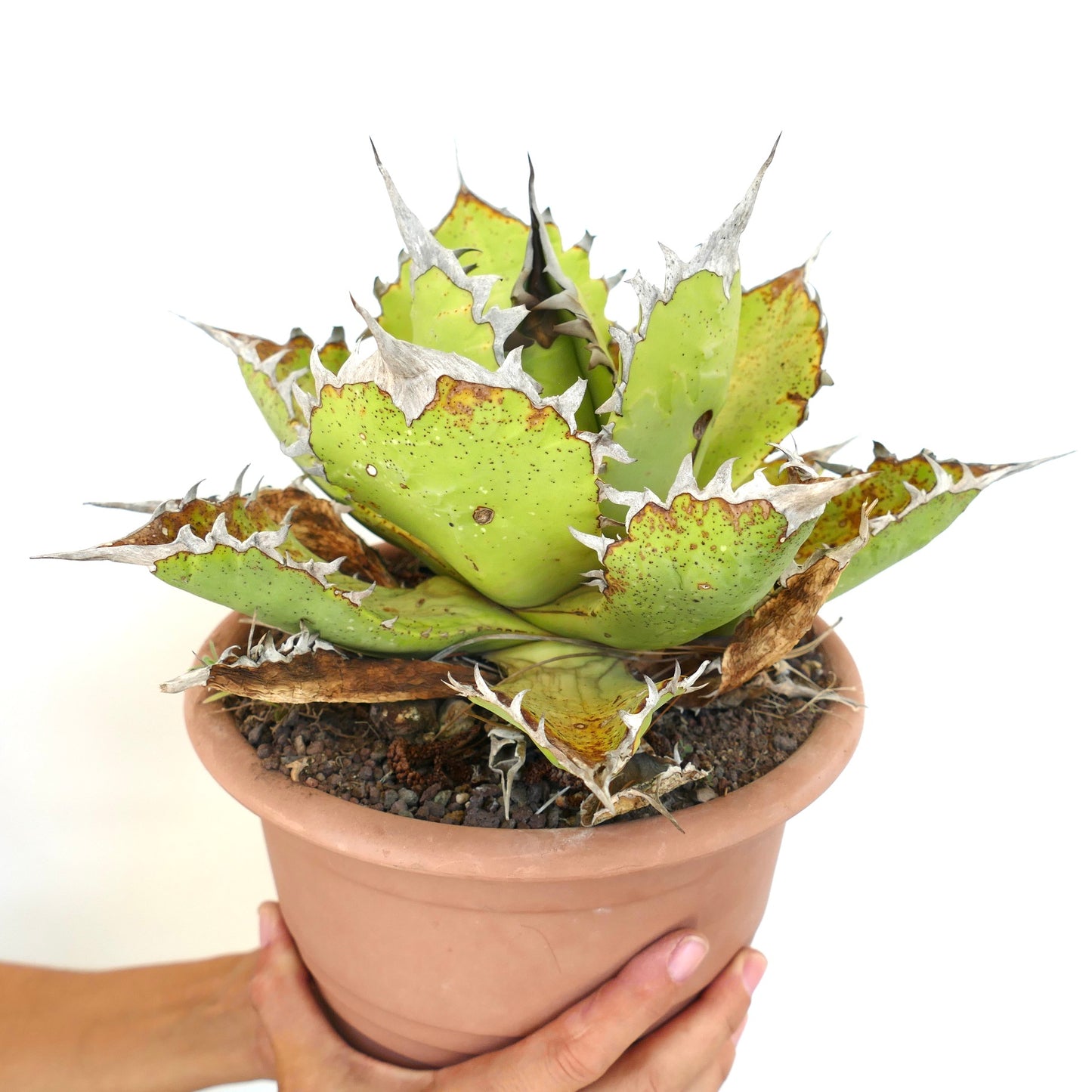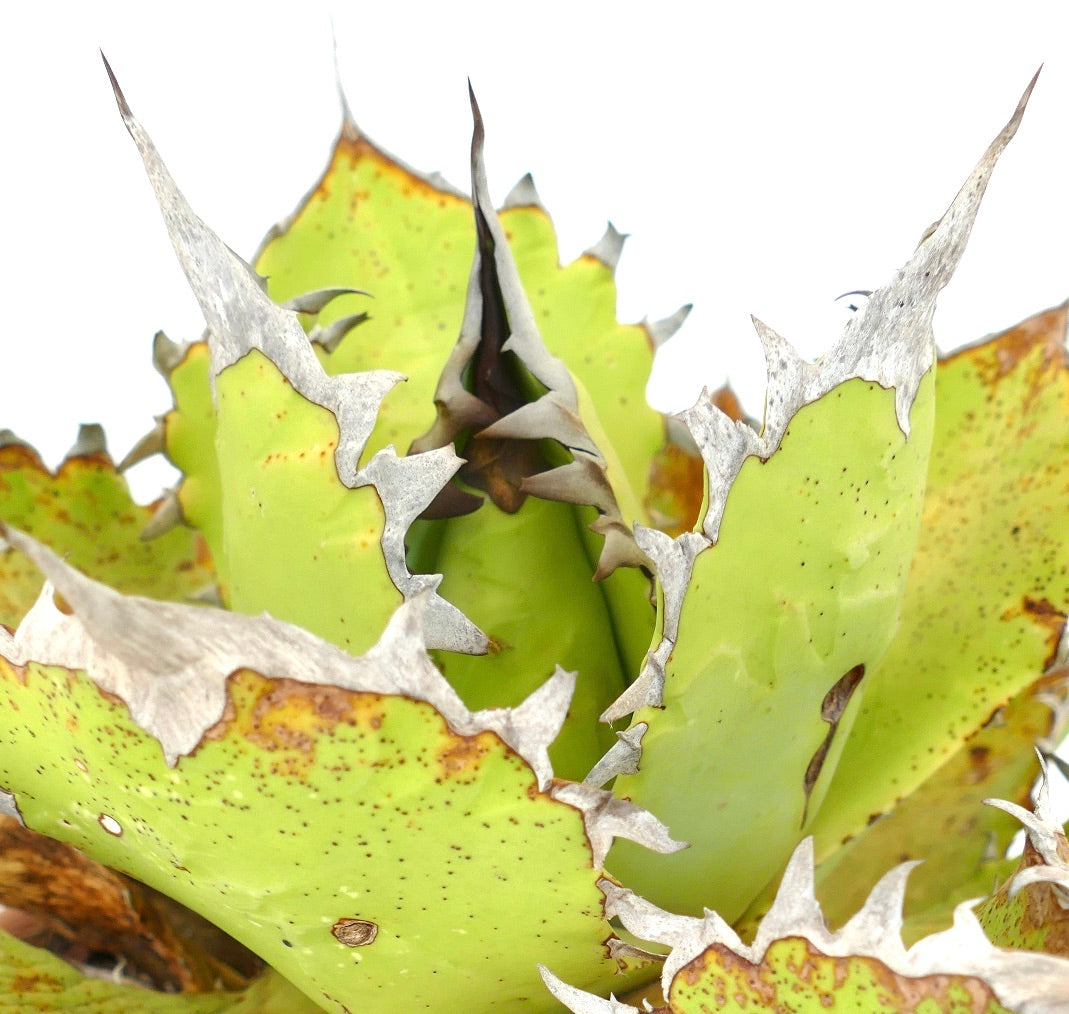 Agave oteroi is a striking succulent native to Mexico, known for its compact rosette of thick, fleshy leaves with sharp, prominent spines along the edges. The leaves are a blue-green color with distinctive impressions of neighboring leaves, adding to its visual appeal. At maturity, it produces a tall flowering stalk with yellow flowers. This agave's small size and symmetrical form make it a popular choice for rock gardens and containers.