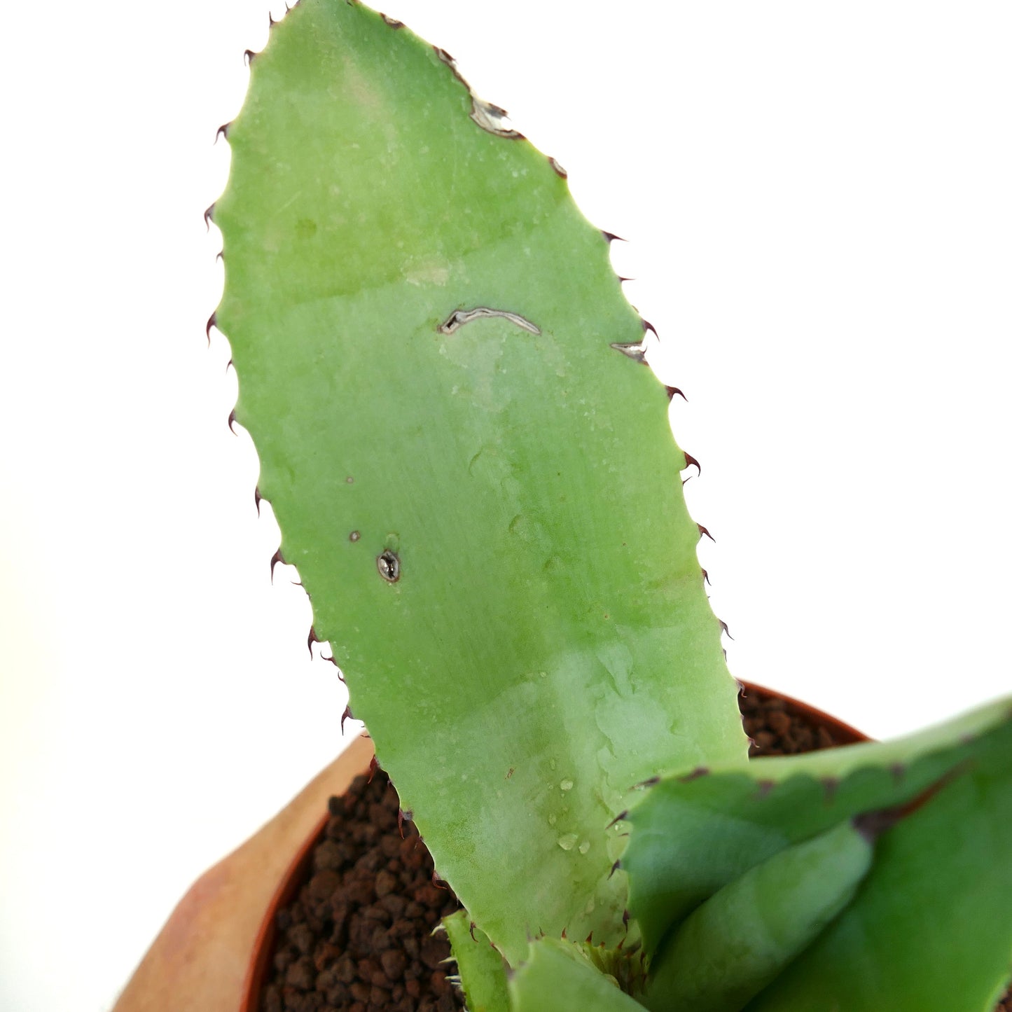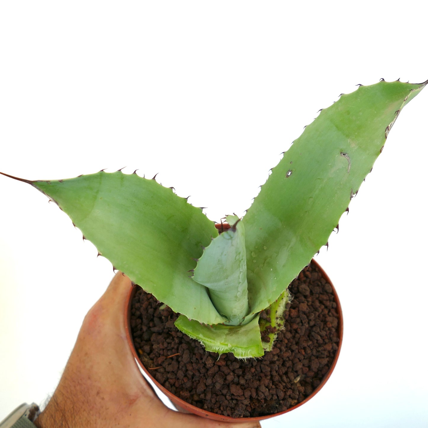 Agave ovatifolia x bovicornuta is a stunning hybrid known for its remarkable rosette form and unique foliage. The leaves are broad, blue-gray, and heavily textured with toothed margins and a pronounced terminal spine. Each leaf's powdery surface gives the plant a distinctive look, adding to its architectural appeal. This hybrid can reach up to 3 feet in height and spread, making it an impressive focal point in any landscape or garden. With its drought-tolerant nature, this agave is perfect for xeriscaping and low-maintenance gardens.
