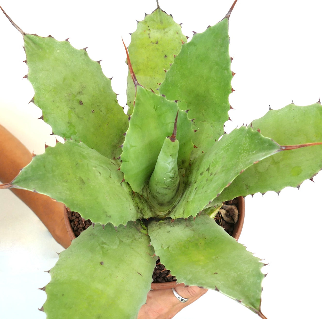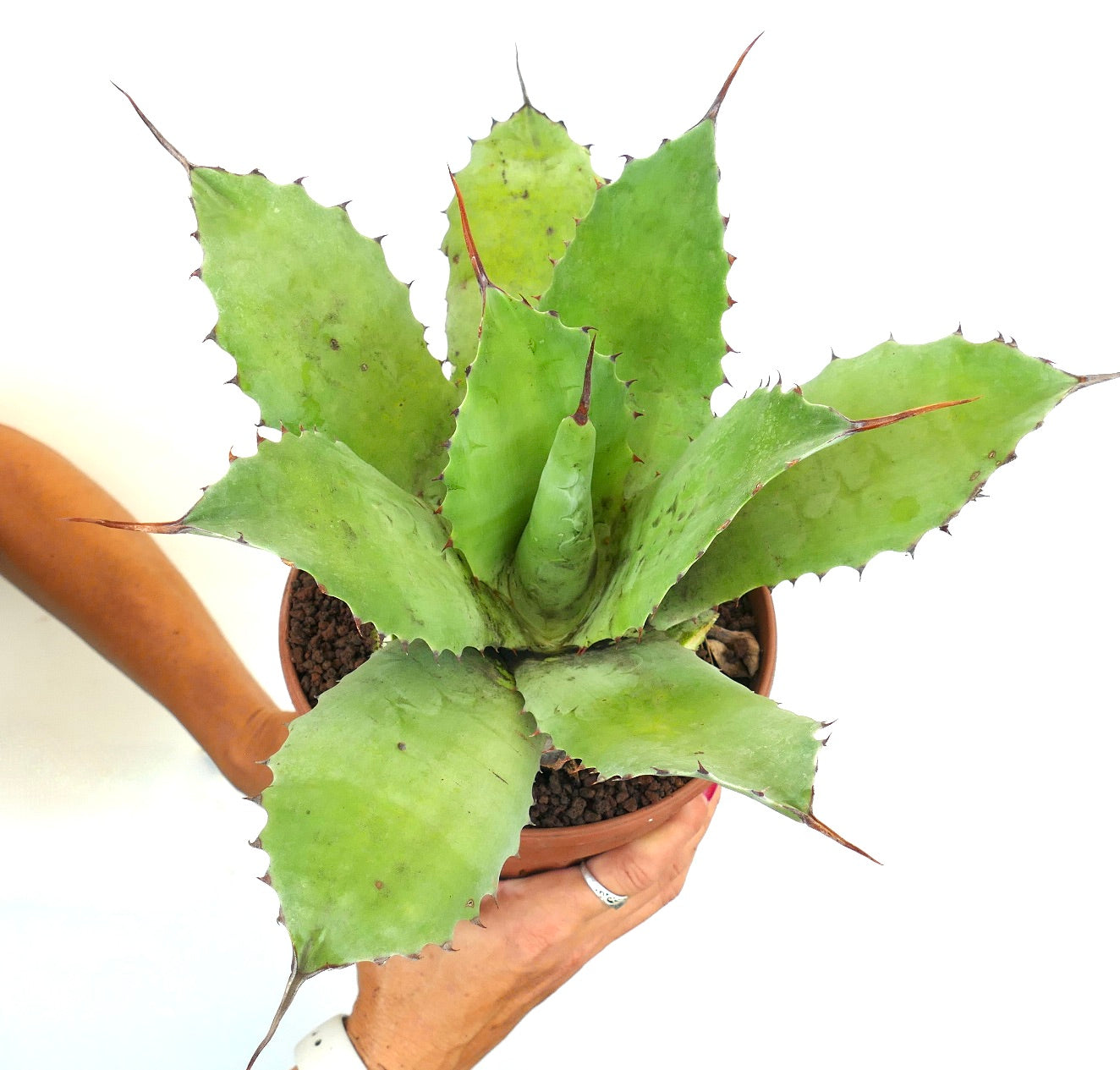 Agave ovatifolia x bovicornuta clone R15 is a stunning hybrid with distinctive features. This agave boasts broad, blue-green leaves with a smooth texture, edged with soft, flexible spines. The leaves form a tight, symmetrical rosette that can reach up to 3 feet in diameter. The unique blend of parent plants gives it an attractive appearance with the ovatifolia's wide leaves and the bovicornuta's notable teeth and marginal spines. This hybrid agave is both visually striking and robust, suitable for landscape or container gardening in various climates.