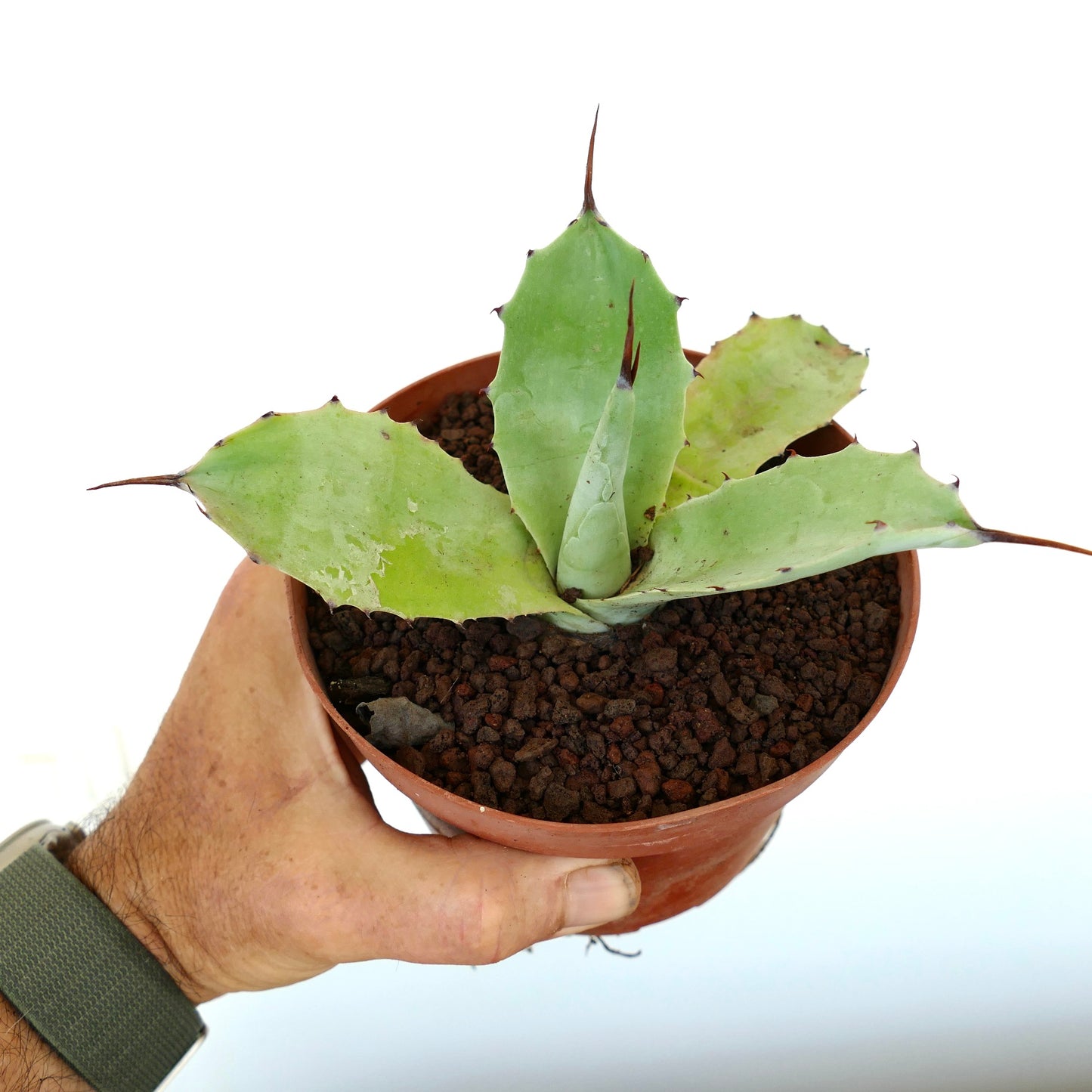 Agave parryi X ovatifolia is a stunning hybrid known for its remarkable rosette form and unique foliage. The leaves are broad, blue-gray, and heavily textured with toothed margins and a pronounced terminal spine. Each leaf's powdery surface gives the plant a distinctive look, adding to its architectural appeal. This hybrid can reach up to 3 feet in height and spread, making it an impressive focal point in any landscape or garden. With its drought-tolerant nature, this agave is perfect for xeriscaping and low-maintenance gardens.