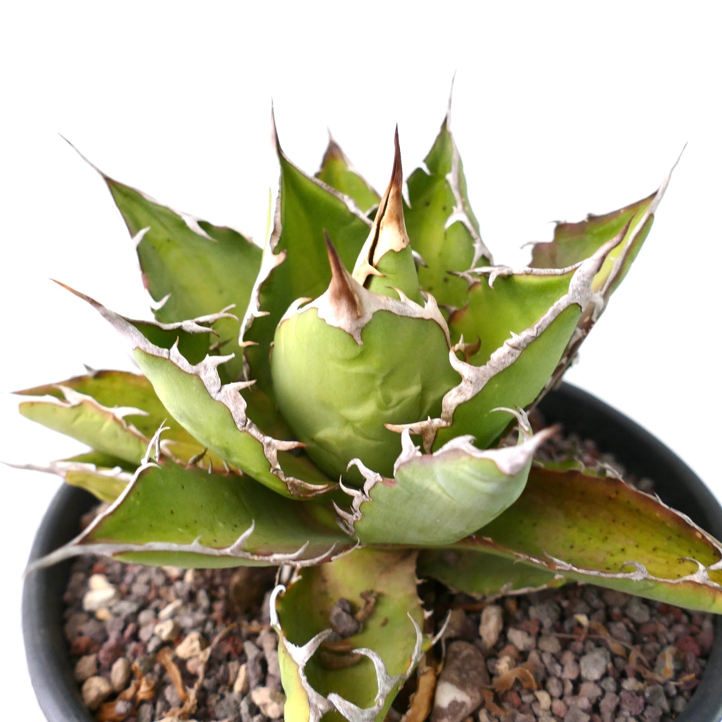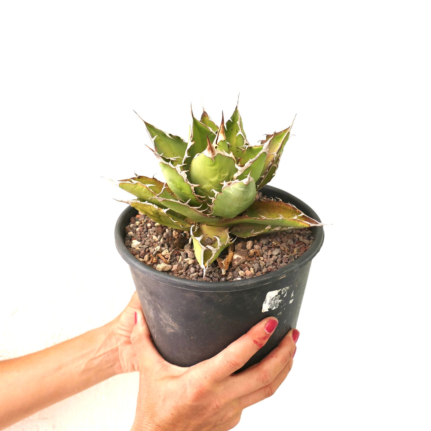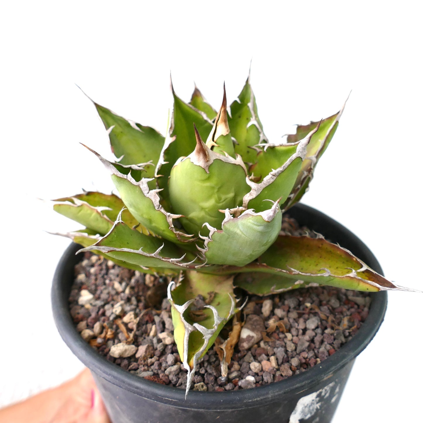 Agave titanota is a stunning succulent known for its compact, symmetrical rosette of broad, thick leaves. The leaves are bluish-green with a hint of gray, edged with prominent, sharp teeth that give the plant a fierce yet beautiful appearance. The margins of the leaves are typically white or pale, adding a striking contrast to the darker leaf surface. This agave can grow up to 2 feet in diameter, making it a standout feature in any garden or container. Mature plants may produce a tall flowering stalk with clusters of small, creamy yellow flowers.
