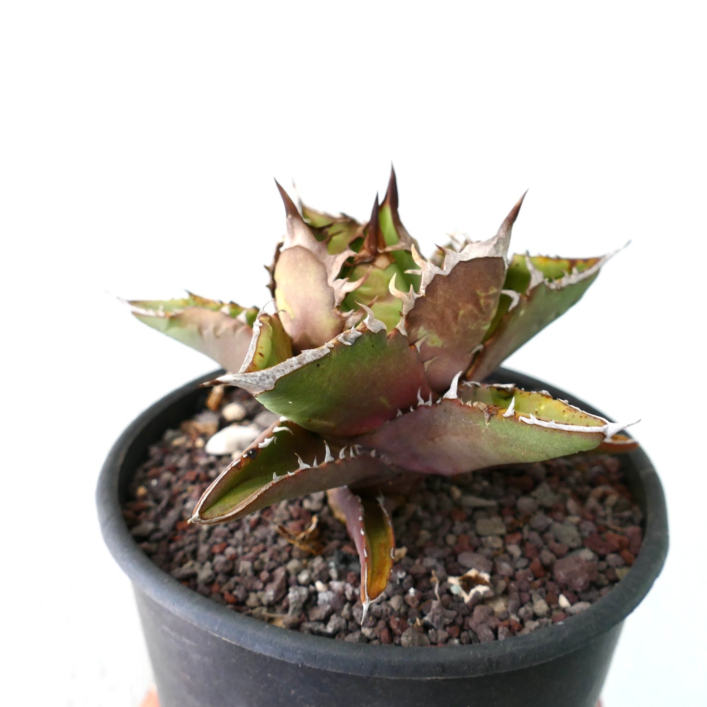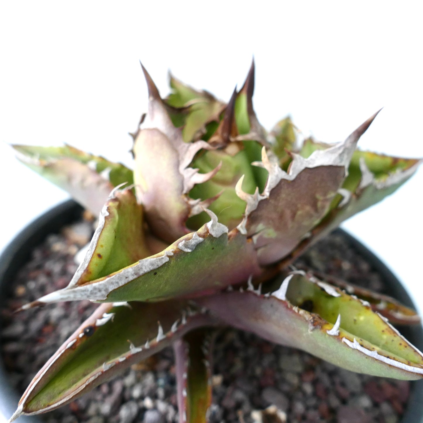 Agave titanota is a stunning succulent known for its compact, symmetrical rosette of broad, thick leaves. The leaves are bluish-green with a hint of gray, edged with prominent, sharp teeth that give the plant a fierce yet beautiful appearance. The margins of the leaves are typically white or pale, adding a striking contrast to the darker leaf surface. This agave can grow up to 2 feet in diameter, making it a standout feature in any garden or container. Mature plants may produce a tall flowering stalk with clusters of small, creamy yellow flowers.