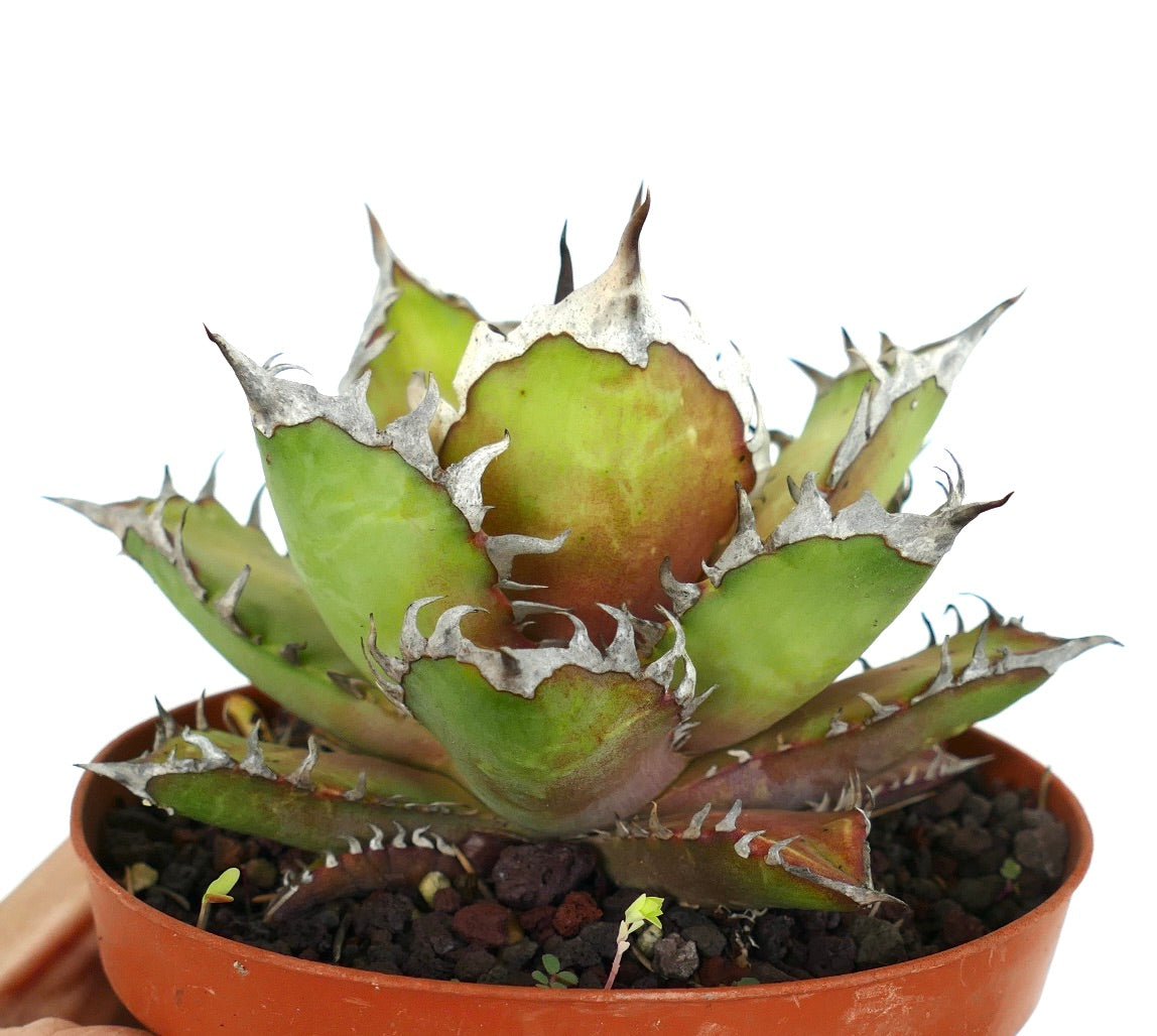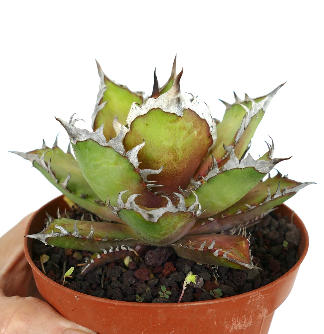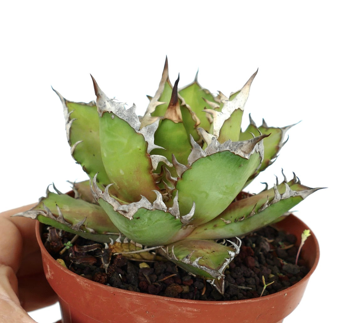 The Agave titanota cv WHITE KING is a magnificent succulent recognized for its imposing rosette that can grow up to 2 feet wide. Its thick, broad leaves are a stunning pale blue-green with white margins and prominent spines along the edges. Each leaf culminates in a sharp terminal spine, enhancing its bold and striking appearance. This cultivar is particularly admired for its pristine white edges, giving it a regal and majestic look. Perfect for xeriscaping and as a container plant, this agave adds a touch of elegance to any collection.