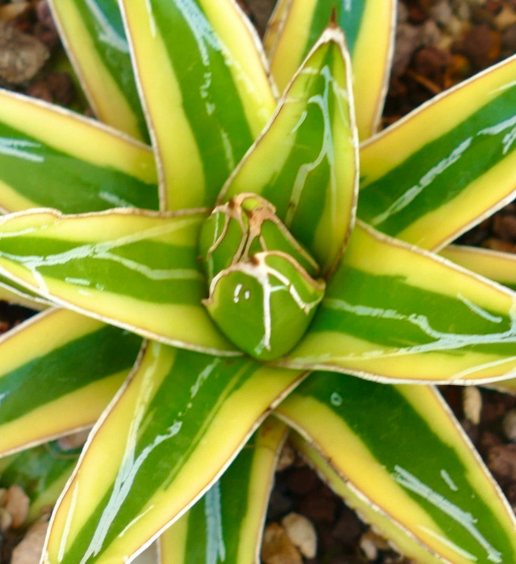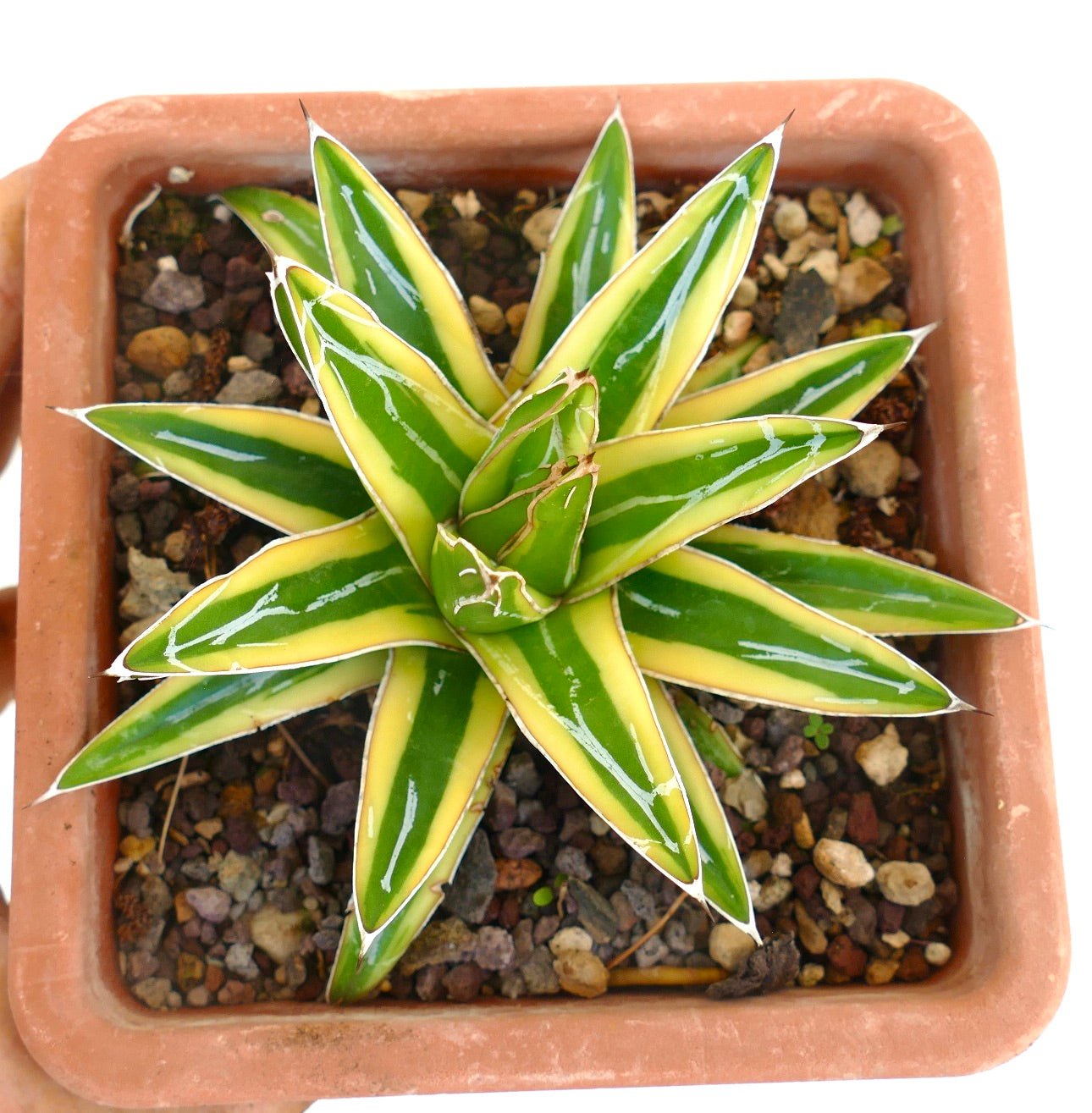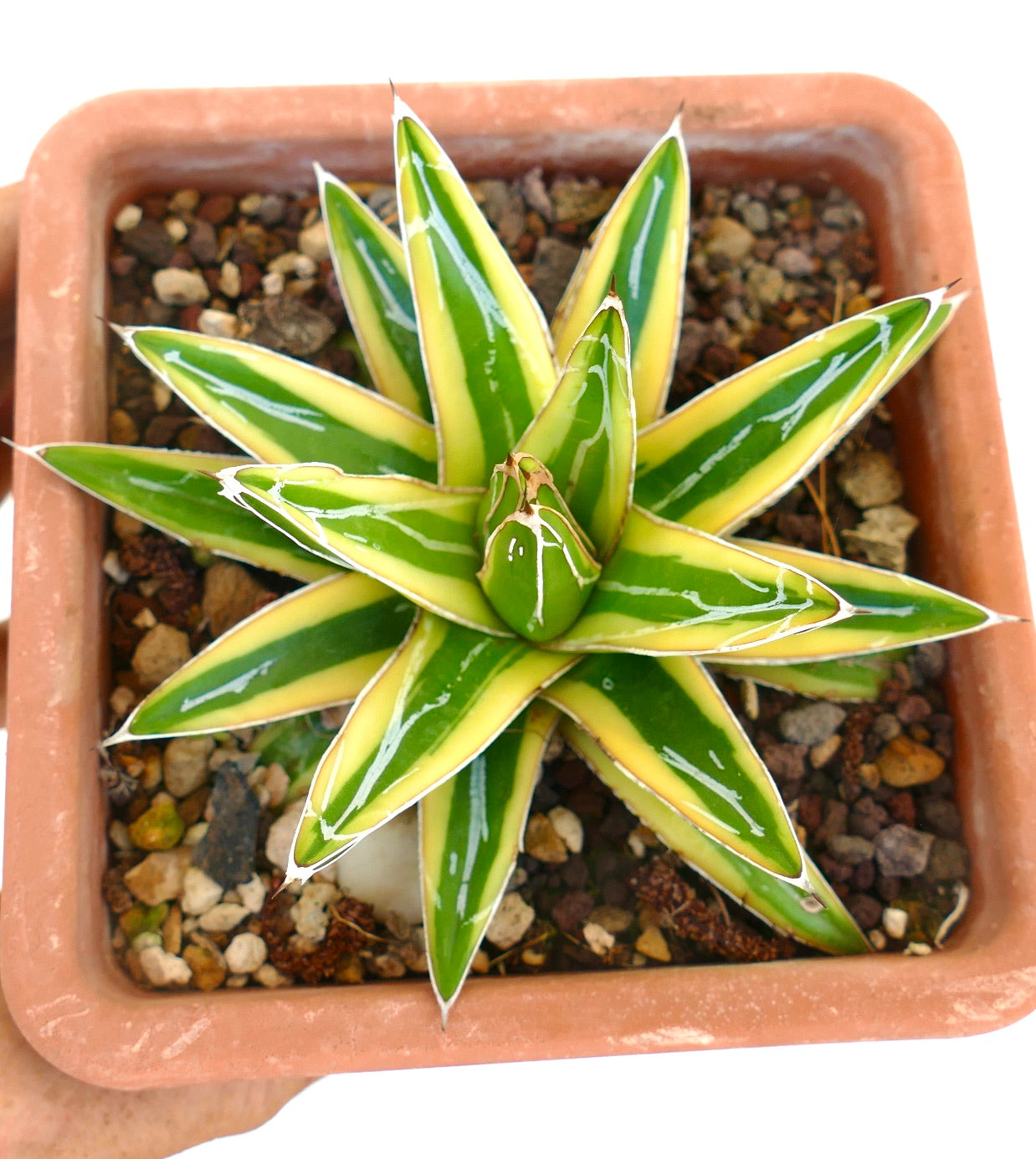 Agave victoriae-reginae cv. “Shin Yuki Yama” is a stunning and distinctive succulent known for its compact, rosette-shaped form with triangular, thick leaves. This cultivar features creamy white and green variegation on its leaves, creating a striking contrast that makes it stand out in any collection. The leaves are edged with fine, white markings and have a smooth texture with a sharp, terminal spine. This agave is relatively slow-growing and forms a neat, symmetrical rosette that remains small and manageable. Its unique variegation and tidy growth habit make Agave victoriae-reginae cv. “Shin Yuki Yama” a prized addition to any succulent enthusiast’s collection.