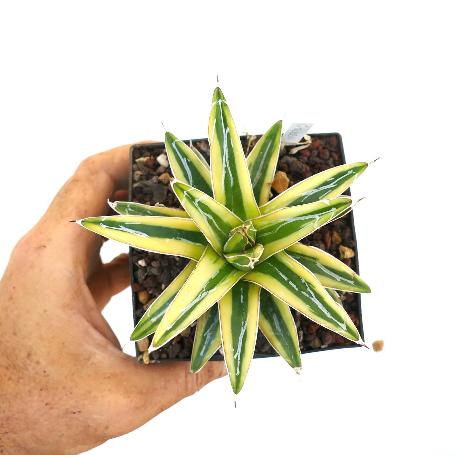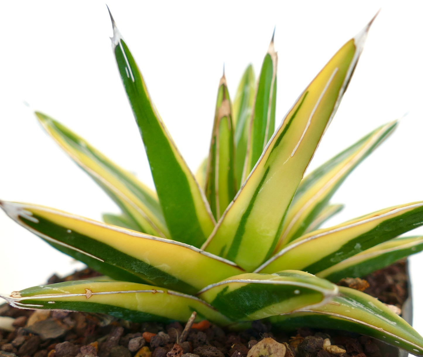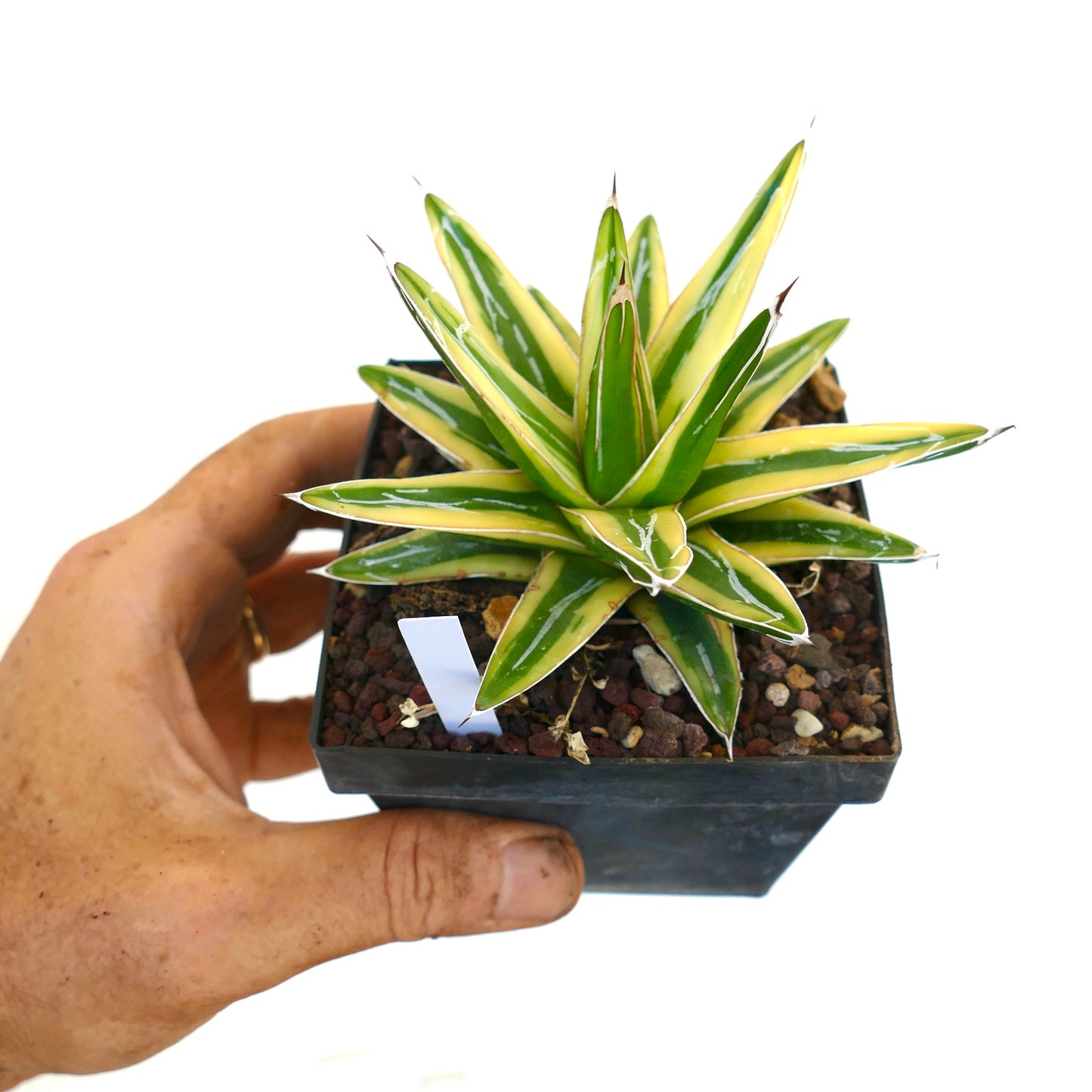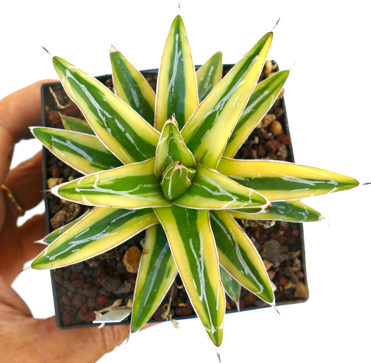 Agave victoriae-reginae cv. “Shin Yuki Yama” is a stunning and distinctive succulent known for its compact, rosette-shaped form with triangular, thick leaves. This cultivar features creamy white and green variegation on its leaves, creating a striking contrast that makes it stand out in any collection. The leaves are edged with fine, white markings and have a smooth texture with a sharp, terminal spine. This agave is relatively slow-growing and forms a neat, symmetrical rosette that remains small and manageable. Its unique variegation and tidy growth habit make Agave victoriae-reginae cv. “Shin Yuki Yama” a prized addition to any succulent enthusiast’s collection.