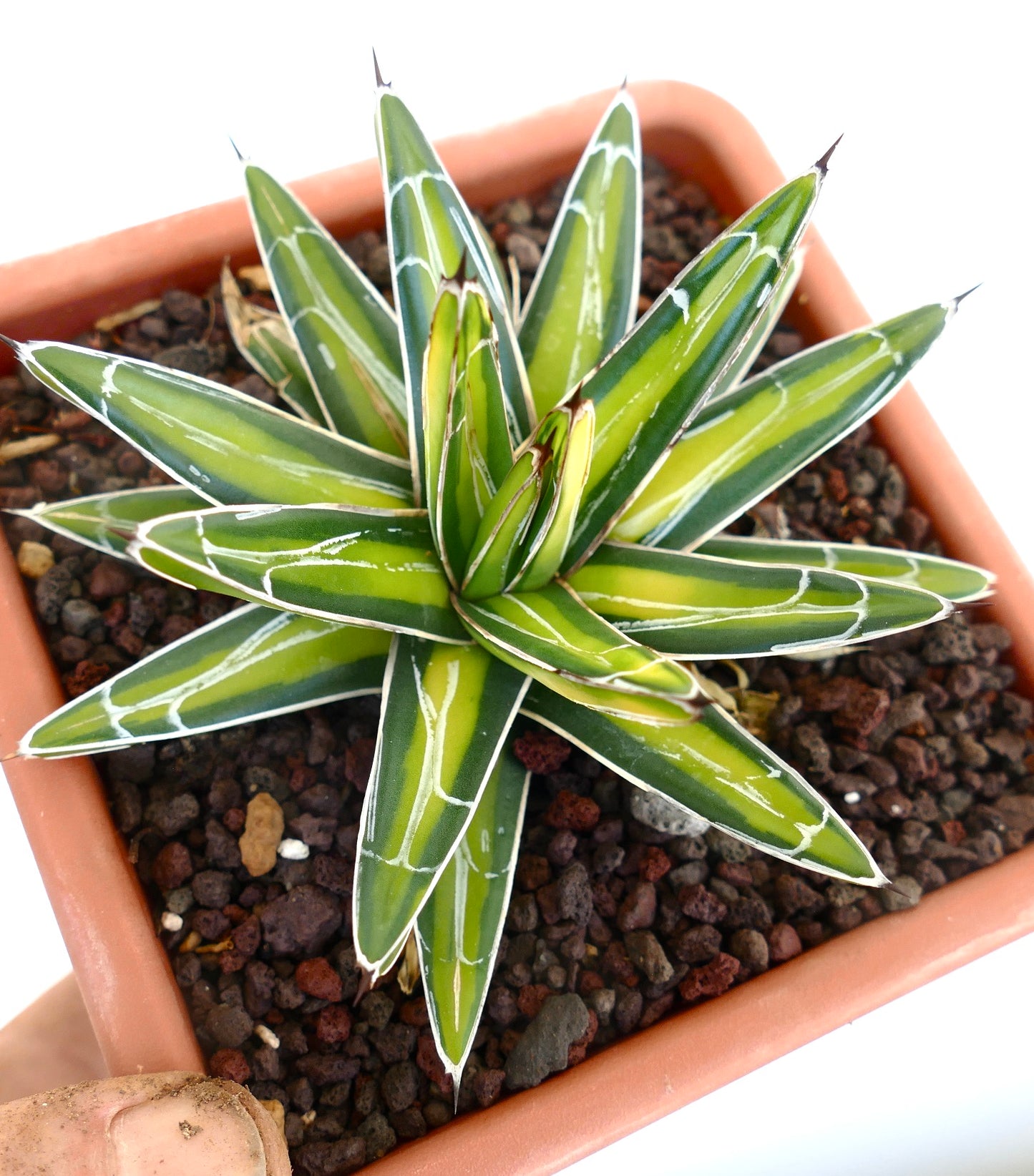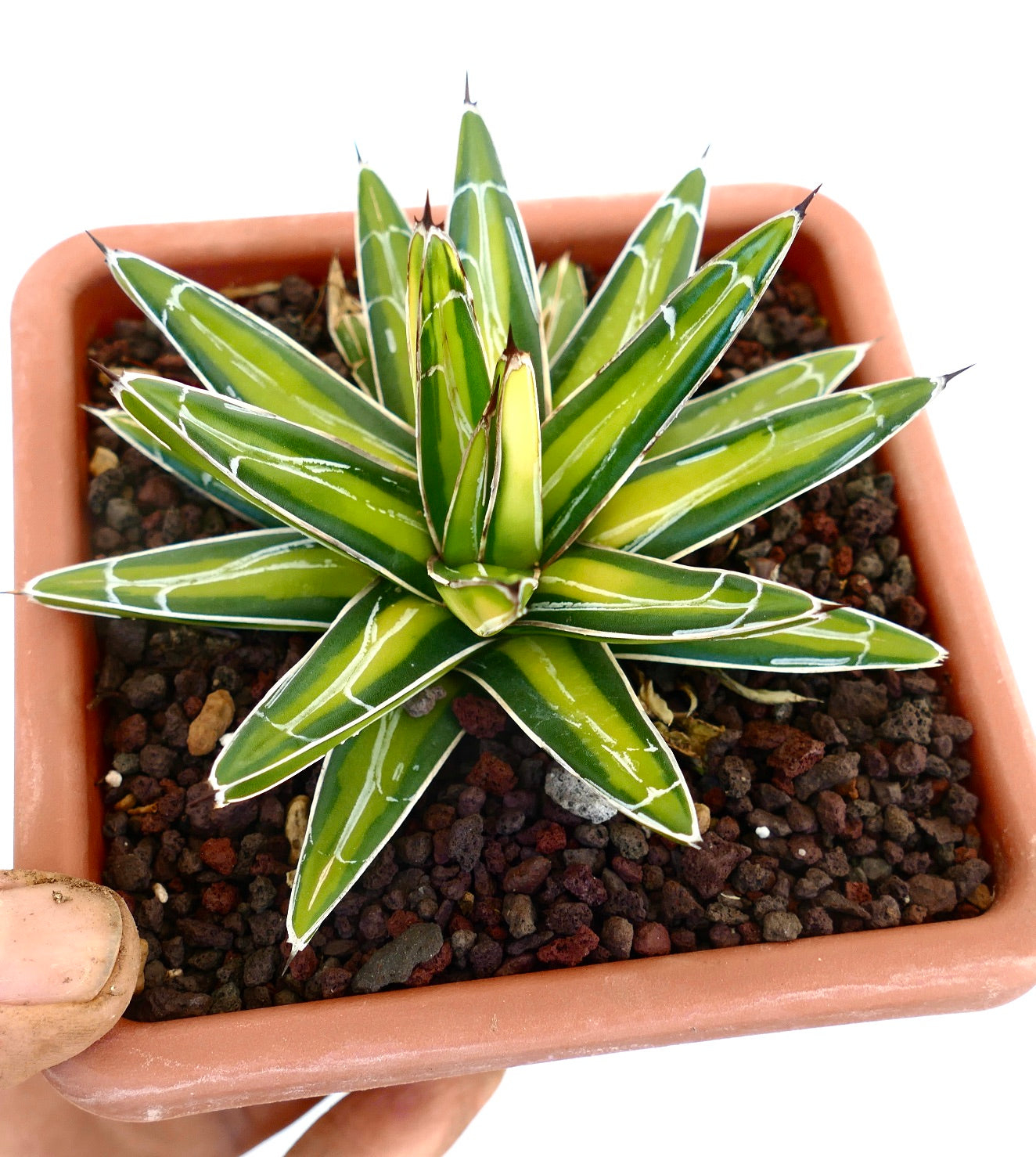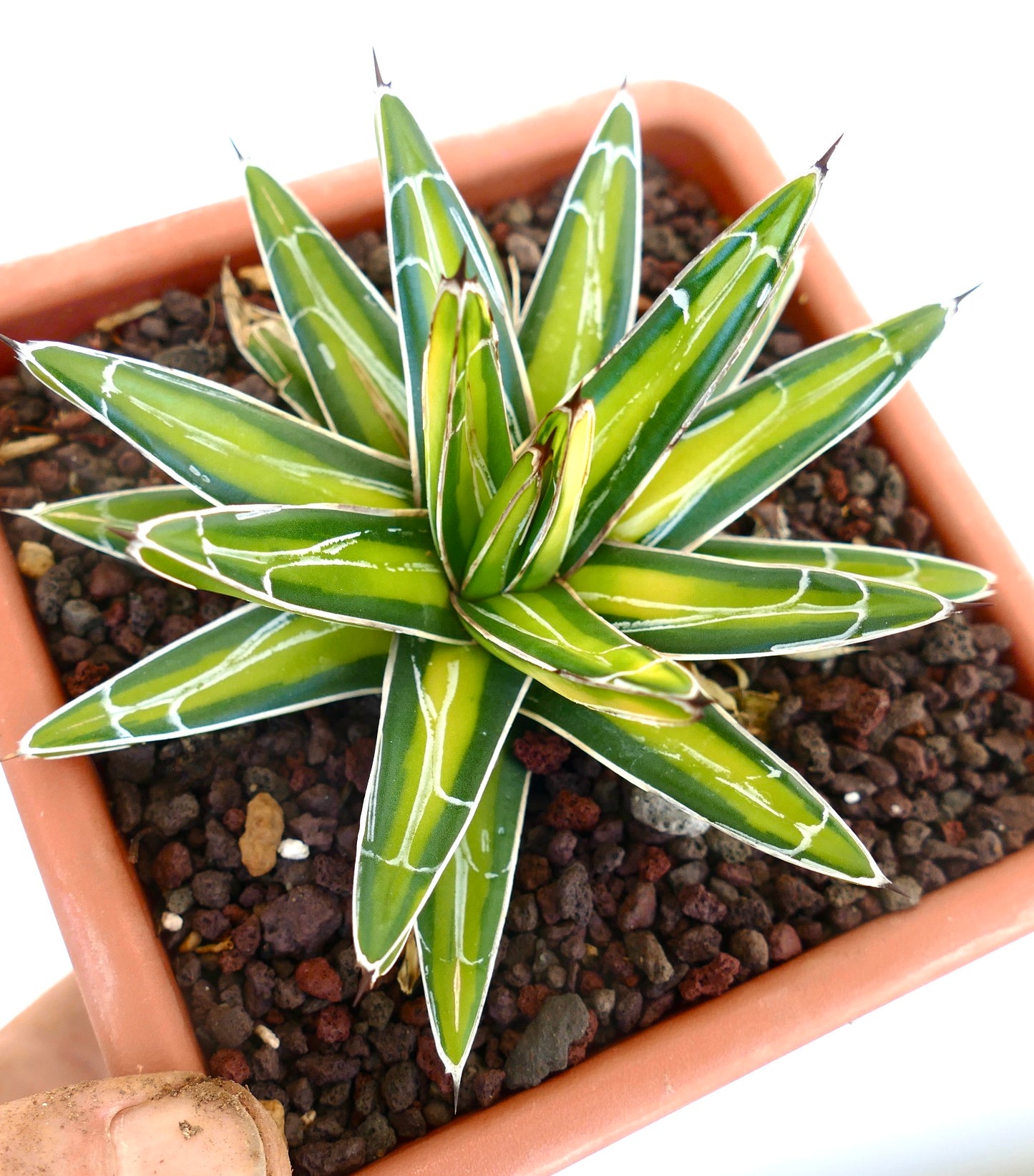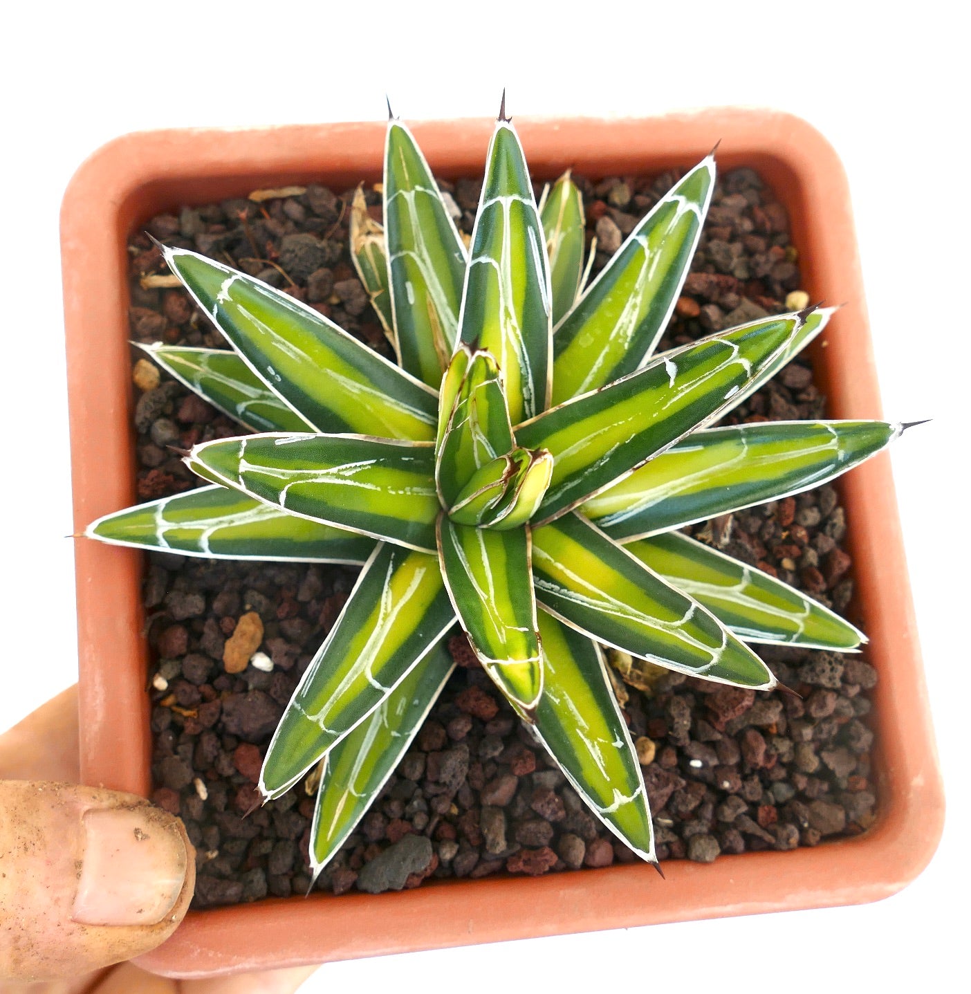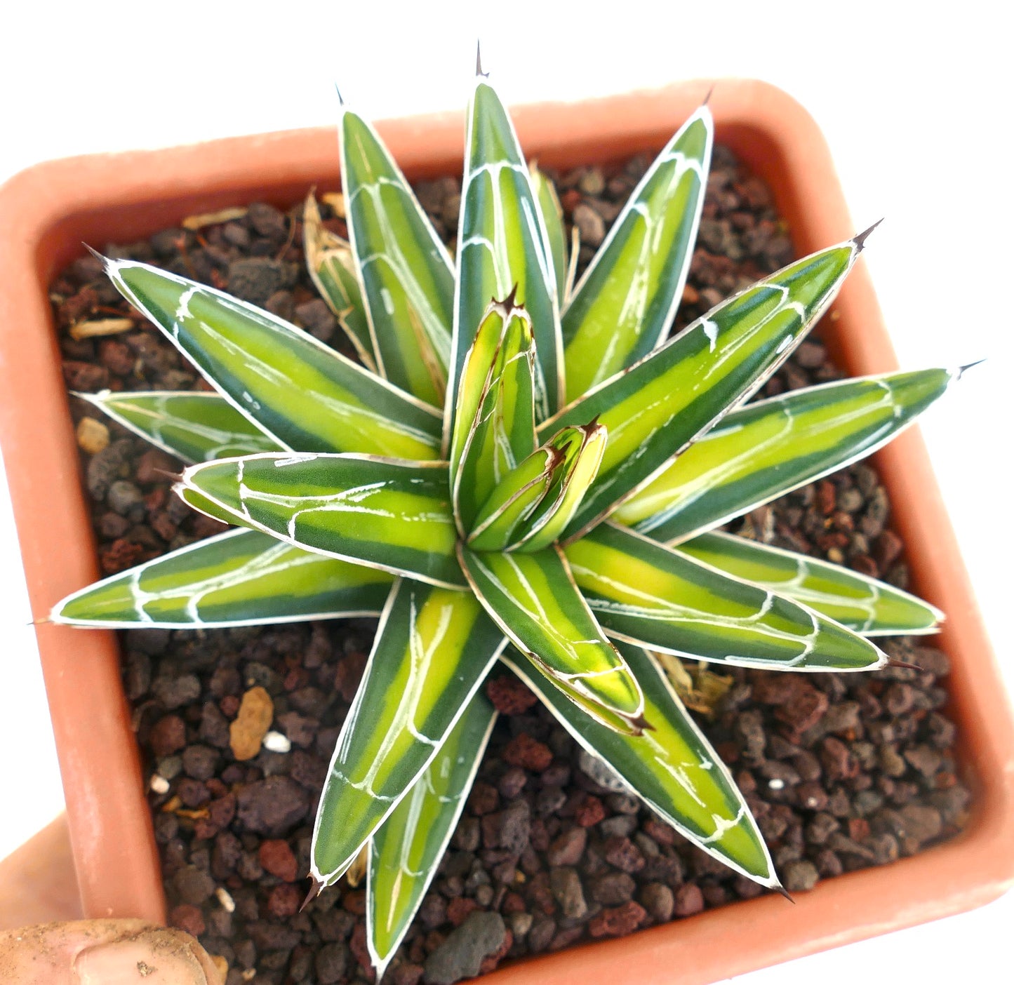 Agave victoriae-reginae YELLOW MEDIOPICTA VARIEGATED is a striking succulent known for its unique yellow and green variegation. The stiff, triangular leaves form a dense, symmetrical rosette with a central band of bright yellow flanked by green edges. Each leaf ends in a sharp terminal spine, adding an element of toughness to its beauty. This agave is compact, making it an excellent choice for both containers and garden beds. Mature plants may occasionally produce a tall flower stalk with small, creamy-white flowers, though flowering is a rare event and typically occurs after many years.