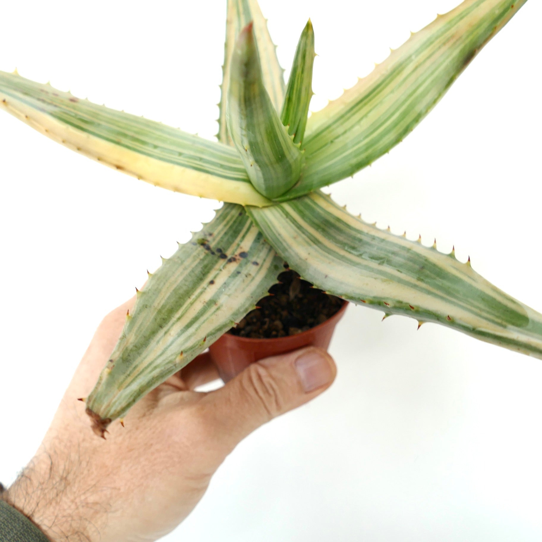 In addition to its visual appeal, the variegated Aloe ferox carries the heritage of the iconic South African Aloe family. Its variegation is rare and sought after, offering a fresh twist on the classic Aloe ferox marlothii. This plant combines ruggedness with elegance, making it a standout specimen for collectors and enthusiasts alike.