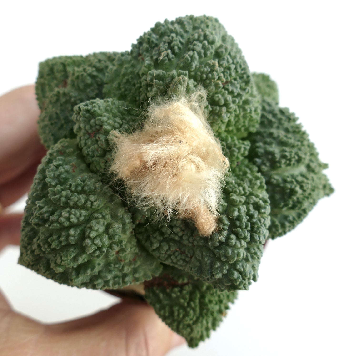 Ariocarpus fissuratus cv. GODZILLA, commonly known as the Godzilla Ariocarpus, is a captivating cultivar of the Ariocarpus fissuratus species. This cactus is grafted onto a more vigorous rootstock to enhance growth and resilience. It features unique, highly textured, and tuberculate surfaces that resemble a reptilian skin, hence the name Godzilla. The plant forms a low, flattened rosette of tubercles that are often grayish-green. It produces striking pink or magenta flowers in the fall. This rare and slow-growing cactus is highly sought after by collectors.