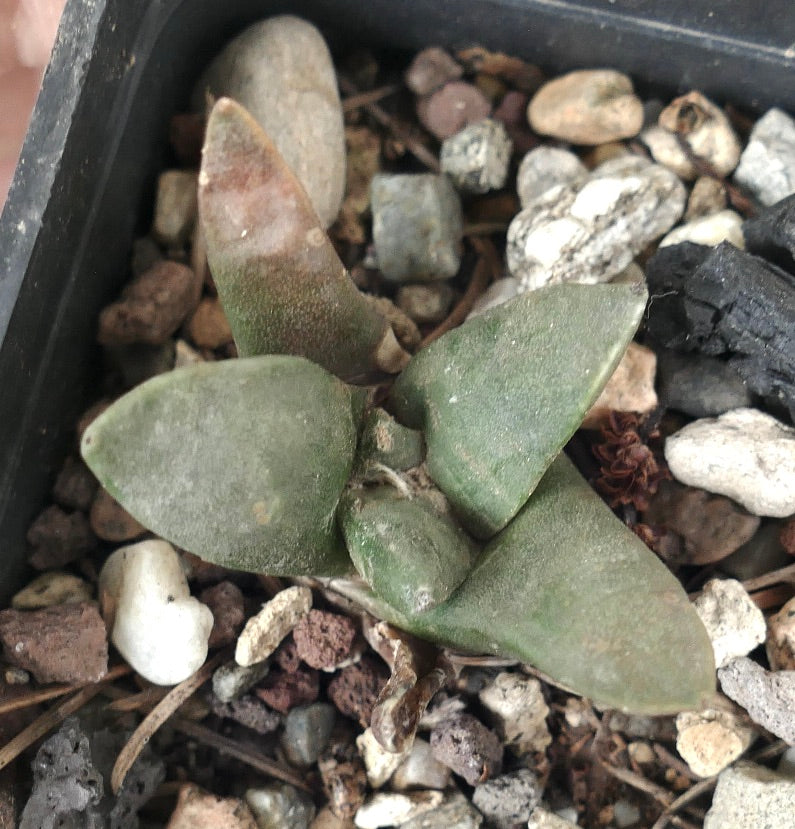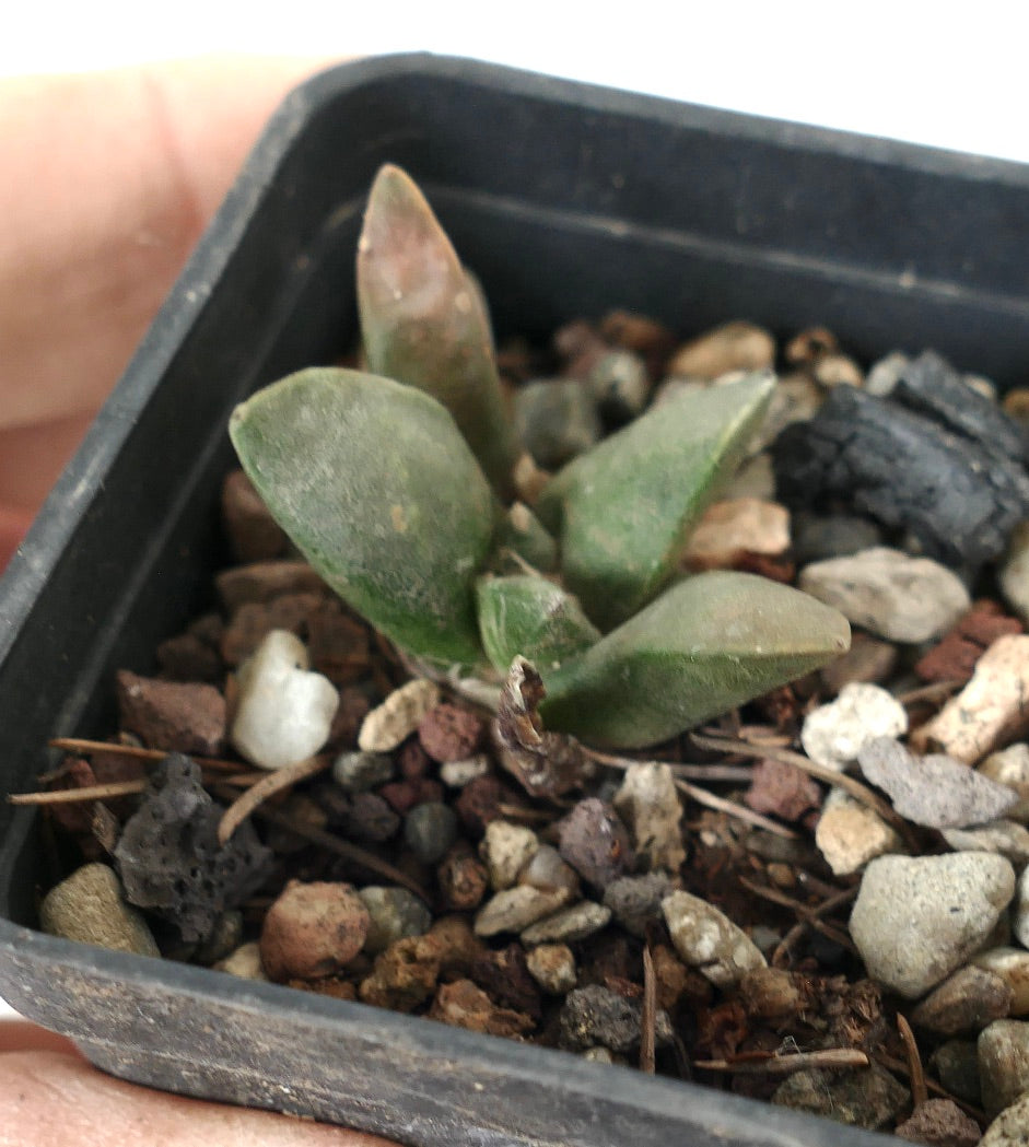Ariocarpus retusus X Ariocarpus retusus cv. MARUIBO is a stunning hybrid cactus that combines the best traits of its parent species. This plant features large, flattened tubercles arranged in a compact rosette, creating a striking, geometric pattern. The tubercles are typically gray-green to bluish-green, often exhibiting a unique textured surface. During the blooming season, it produces beautiful white to pale pink flowers that emerge from the center of the rosette, adding an elegant contrast to the plant’s robust form. This cactus is well-suited to arid environments and makes a fascinating addition to any succulent collection.