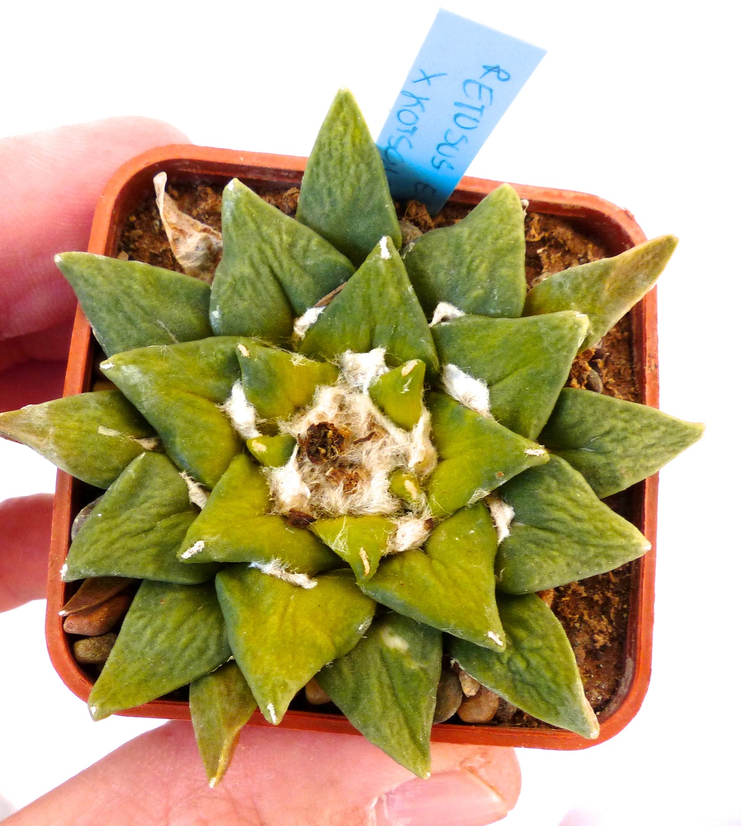 The Ariocarpus retusus x kotschoubeyanus IB19C is a rare and captivating hybrid cactus known for its beautifully arranged tubercles that blend the traits of both parent species. It forms a compact, flat rosette with fleshy, triangular tubercles arranged in mesmerizing geometric patterns. These tubercles are smooth and leathery, colored in shades of grayish-green to bluish-green, giving the plant a stone-like, camouflaged appearance. In autumn, it produces spectacular pink to magenta flowers that emerge from the center, offering a striking contrast against its textured body. This IB19C hybrid is highly prized for its rare form and remarkable beauty, making it a collector's treasure.
