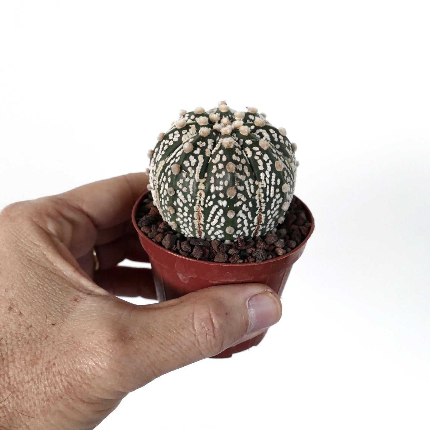 The Astrophytum asterias hybrid shows a perfect balance of form and texture. Its smooth, green surface is dotted with tiny white dots that create a star-like pattern. This Mexican cactus is known for its symmetrical shape and compact size, making it a fascinating addition to any plant collection. The hybrid vigor also brings subtle variations in spine development and coloration.