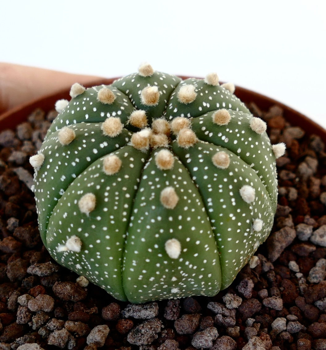 Astrophytum asterias 'Rio Grande Texas' is a highly sought-after variety of the Astrophytum asterias cactus, native to the Rio Grande region of Texas. This cactus features a distinct, flattened, disk-like shape with 8-10 pronounced ribs and minimal spines. Its green body is adorned with white, star-shaped areoles, which give it a unique, speckled appearance. The plant produces large, showy yellow flowers with orange centers during the growing season, typically in late spring to summer. Known for its compact form and striking pattern, it's a favorite among cactus collectors.