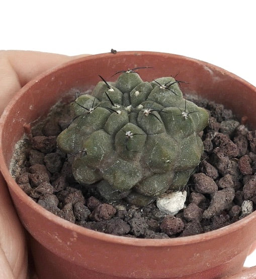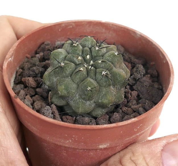 Copiapoa cinerea form nuda is a striking, slow-growing cactus native to the coastal deserts of northern Chile. It features a globular to slightly columnar body that can reach up to 10-15 cm in height and 5-10 cm in diameter. Its skin is a smooth, blue-gray to silvery-gray, often with a waxy coating that helps protect it from the harsh sun. Unlike other forms, 'nuda' lacks spines or has very minimal, short spines. In summer, it produces small, yellow, funnel-shaped flowers that contrast beautifully with its smooth surface. This cactus is highly prized for its unique, smooth appearance and low maintenance requirements.