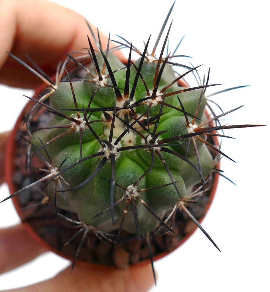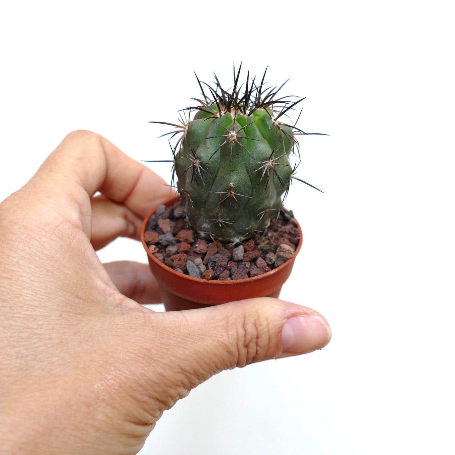 Copiapoa atacamensis X cinerea is a hybrid cactus that features characteristics of both Copiapoa atacamensis and Copiapoa cinerea. This plant usually grows in a globular to slightly elongated form, reaching up to 25 cm in height and 15 cm in diameter. The skin is a striking blue-gray to grayish-green, often coated with a whitish bloom that helps protect it from the harsh desert sun. The spines are sturdy, short, and spread out evenly, ranging in color from yellowish to grayish-brown. In the summer, it produces bright yellow flowers, creating a vivid contrast against the muted tones of its body.
