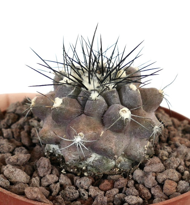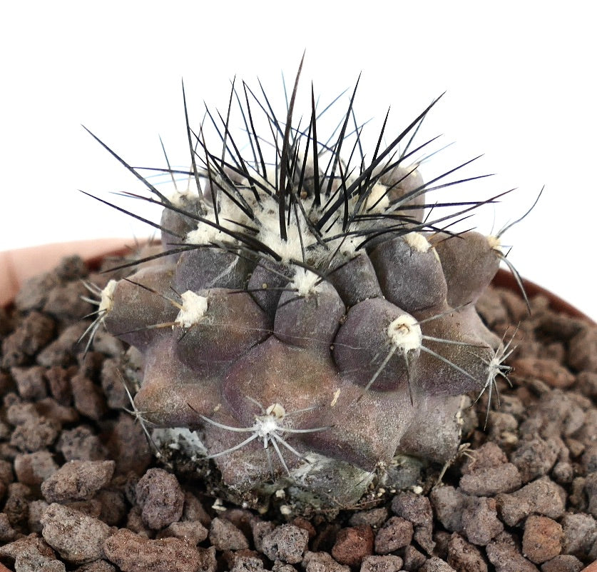 Copiapoa atacamensis X Copiapoa cinerea is a hybrid cactus known for its distinctive grey and black spines. This rare plant combines the best traits of its parent species, showcasing a silvery-grey epidermis with dramatic black spines that create a striking visual contrast. Native to the Atacama Desert, it thrives in sunny and arid conditions. Its slow growth and ability to form dense clusters make it a prized specimen for cactus enthusiasts and succulent collectors. Perfect for adding a touch of exotic beauty to your collection.