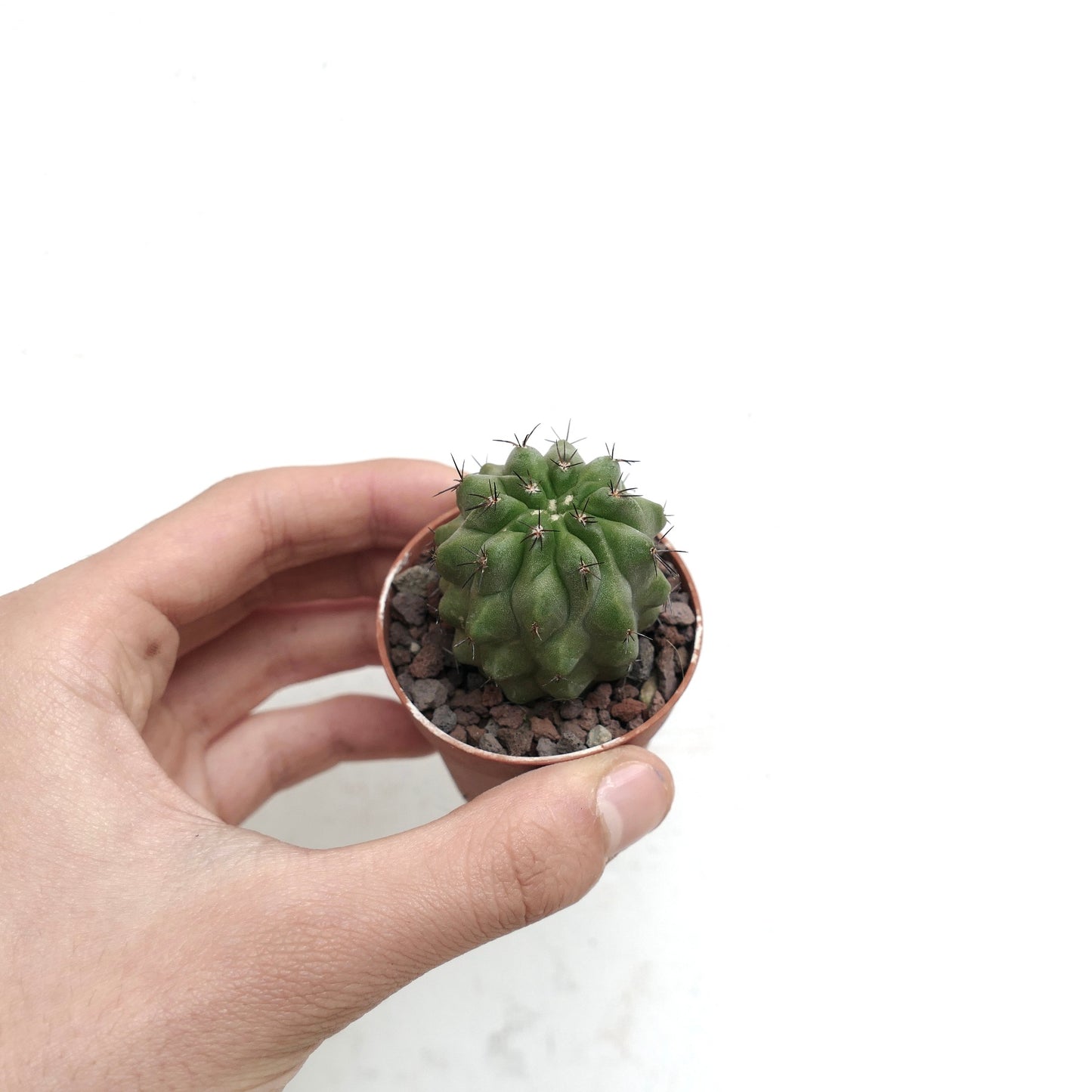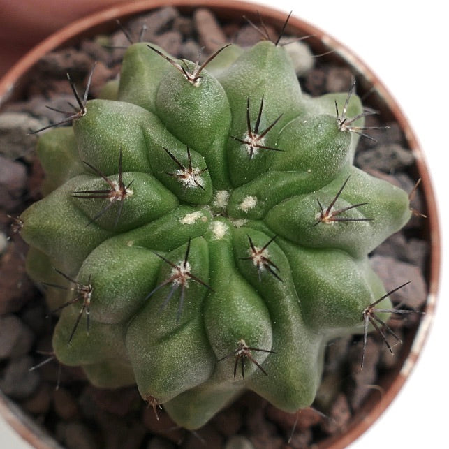 Copiapoa hybrids are fascinating results of crossbreeding within the Copiapoa genus, native to the deserts of northern Chile. These hybrids typically inherit the robust, globular form of their parent species, featuring thick, waxy skins to minimize water loss. The surface is often dotted with areoles from which spines of varying thickness and length protrude, providing defense against herbivores. The flowers of Copiapoa hybrids are usually yellow or white, blooming close to the crown of the cactus and offering a striking contrast to their dark, greenish-grey bodies.