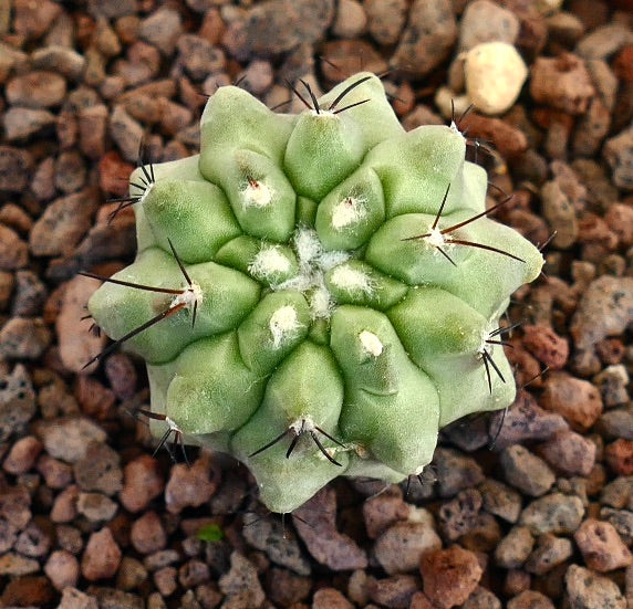 The Copiapoa cinerea x hypogaea captivates collectors with its unique hybrid vigor and striking appearance. This hybrid cactus combines traits from both parent species, resulting in a compact form with short spines green in color. Originating from the arid regions of Chile, this Chilean cactus thrives in desert environments, showcasing resilience and a fascinating morphology that stands out in any collection.