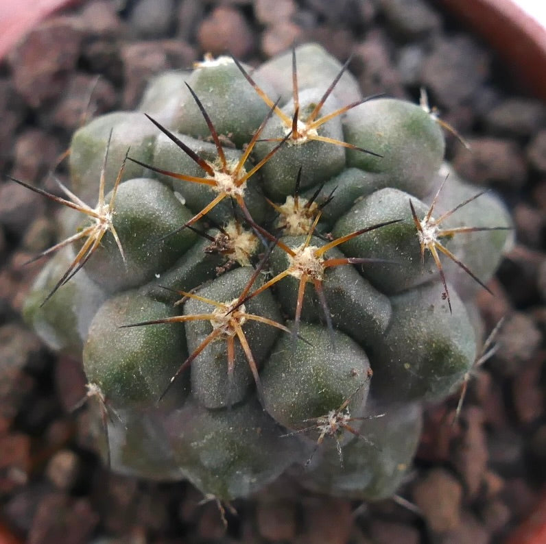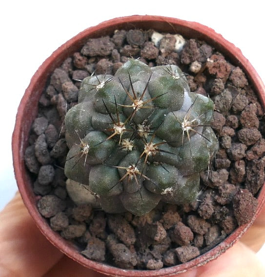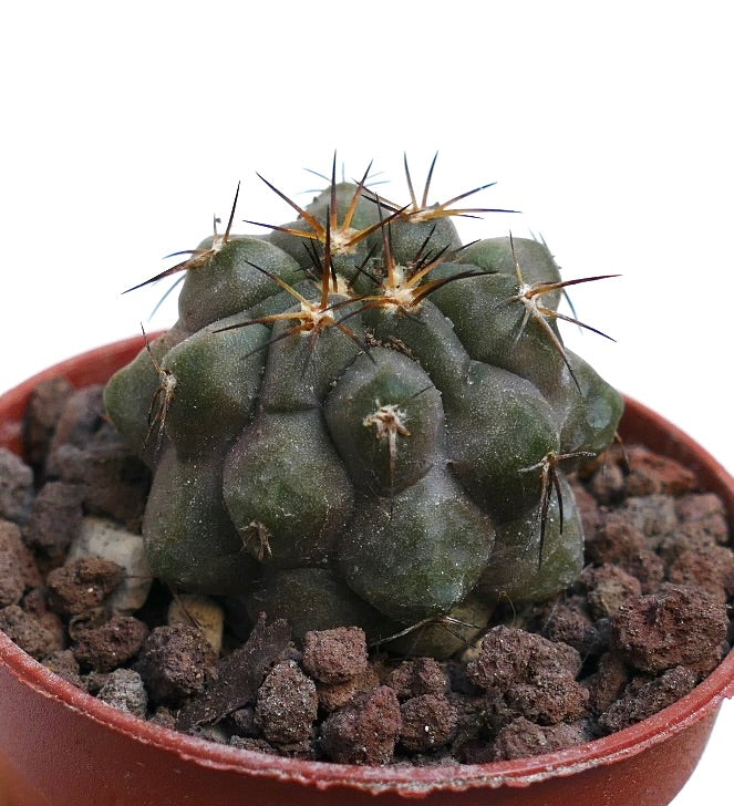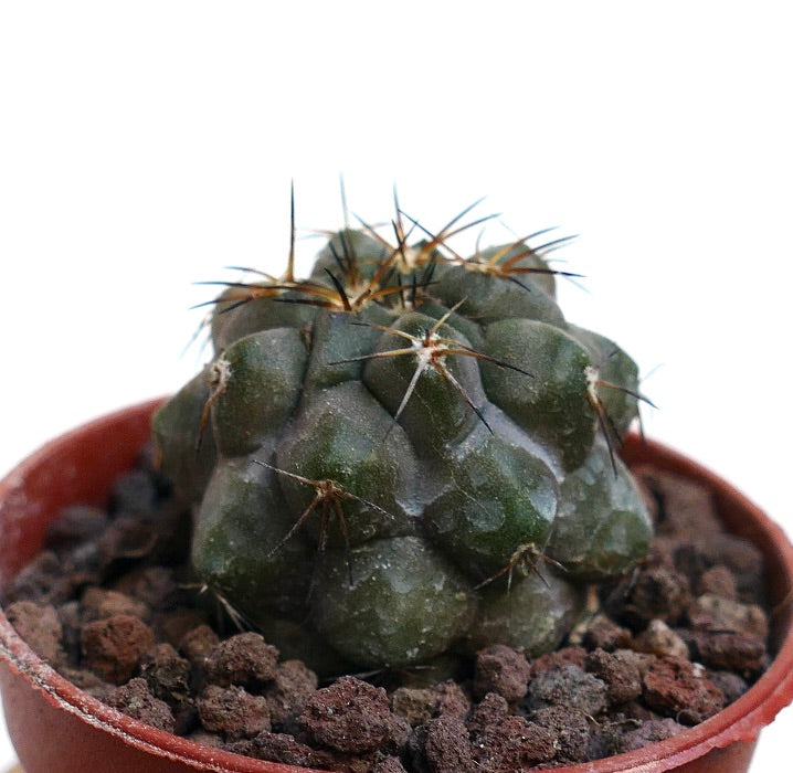 A striking rarity of the Atacama Desert, Copiapoa solaris is a marvel of botanical adaptation, sculpted by one of the driest environments on Earth. This stunning cactus forms solitary or slightly clumping hemispherical bodies that reach up to 25 cm in diameter, cloaked in a dense array of woolly areoles and prominent golden to coppery spines that radiate like solar flares—hence its evocative name. The epidermis is a rich, dark green to greyish hue, often dusted with a natural, waxy bloom that protects it from intense sunlight and UV radiation. In summer, Copiapoa solaris produces modest yet beautiful yellow flowers nestled among its crown, contrasting vividly with its armored body. Extremely slow-growing and extremely rare in cultivation, it is one of the most coveted Copiapoa species by collectors for its distinctive coloration, solitary growth habit, and desert-forged silhouette. Endemic to northern Chile, it symbolizes the extremities of xerophytic life and the sheer artistry of natural selection.