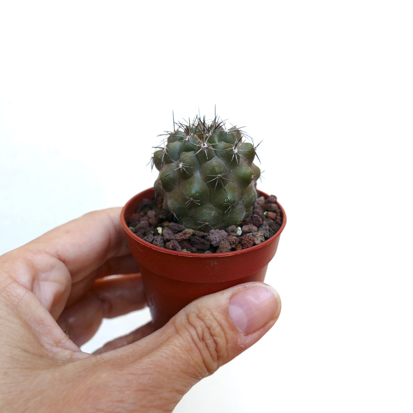 Copiapoa desertorum X fiedleriana is a hybrid cactus that blends traits from both Copiapoa desertorum and Copiapoa fiedleriana. This hybrid typically grows in a globular to slightly columnar form, reaching up to 20 cm in height and 12 cm in diameter. The skin ranges from grayish-green to bluish-gray, often covered with a fine layer of white wool that helps protect it from intense sunlight and conserve moisture. The spines are short, robust, and range from white to yellowish-brown, evenly distributed around the areoles. In the summer, this hybrid produces bright yellow flowers, providing a striking contrast against its muted, woolly body.