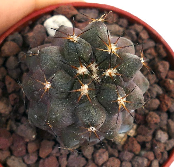Copiapoa cinerea x goldii is a striking hybrid cactus that combines the unique features of Copiapoa cinerea and Copiapoa goldii. This slow-growing cactus features a globular to slightly columnar body, typically measuring 5-15 cm in height and 5-10 cm in diameter. Its skin is a distinctive grayish-green to blue-gray, often covered with a powdery, waxy coating that gives it a silvery appearance. The cactus is adorned with white, woolly areoles and short, dark spines. In summer, it produces small, yellow, funnel-shaped flowers. This hybrid is highly prized for its unique coloration, compact size, and ease of care.