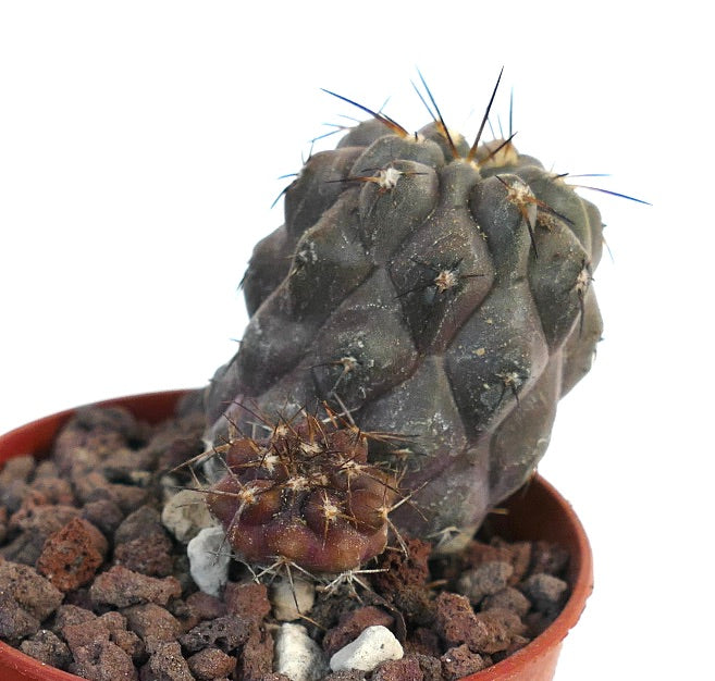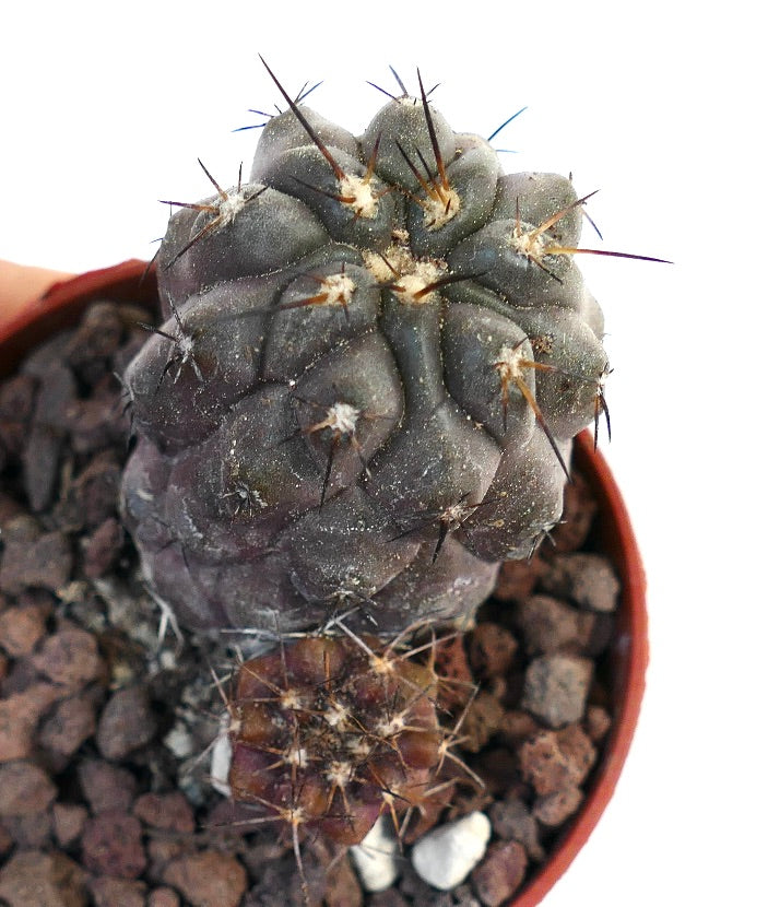 Copiapoa cinerea X serpentisulcata is a hybrid cactus combining characteristics of Copiapoa cinerea and Copiapoa serpentisulcata. This plant features a globular to slightly cylindrical shape with a thick, waxy coating that can range from gray to blue-gray. The stems have pronounced ribs and tubercles, with short, dark spines that can vary in density. It often forms small clusters, each head reaching up to 15 cm in diameter. In the summer, it produces yellow, funnel-shaped flowers from the apex. Native to arid regions, it thrives in rocky, well-draining soils with minimal organic matter.