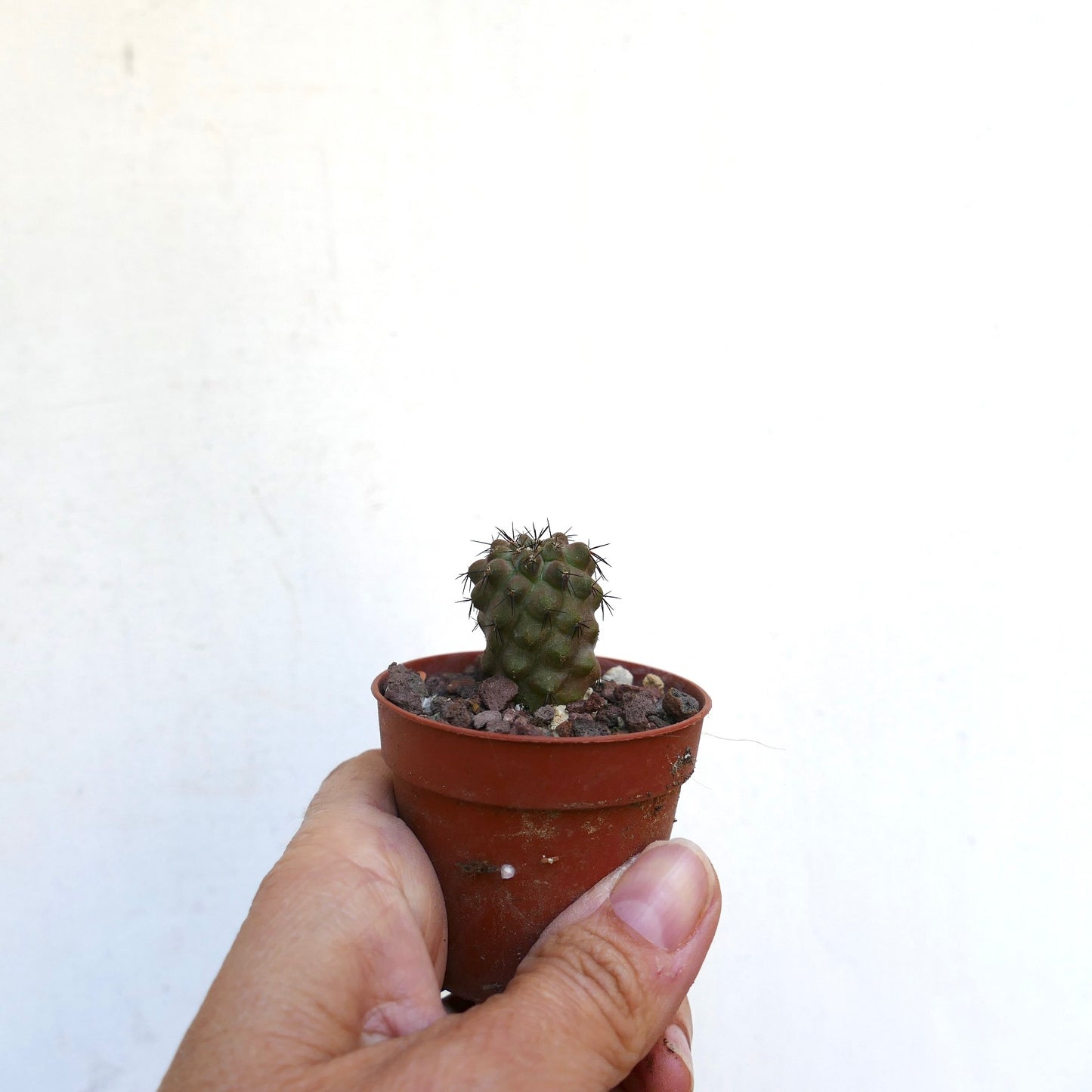 Copiapoa cinerea x tenuissima is a hybrid cactus resulting from the cross between Copiapoa cinerea and Copiapoa tenuissima, both native to the coastal deserts of northern Chile. This hybrid typically forms dense clumps of globular to slightly cylindrical stems, which are bluish-grey with a powdery coating. The stems can grow up to 8 cm in diameter, featuring pronounced ribs with areoles that bear short, dark spines. In summer, it produces small, funnel-shaped yellow flowers. This cactus is highly valued for its striking appearance, resilience in arid environments, and compact growth habit.