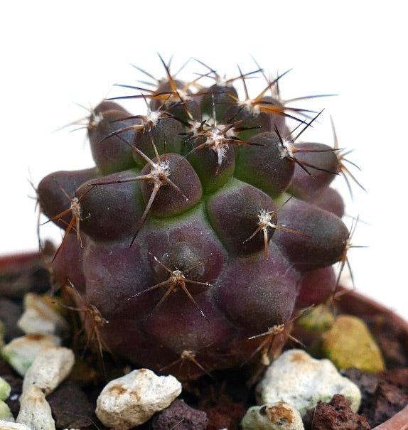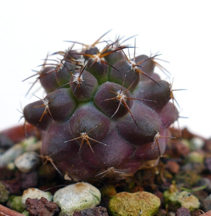 Copiapoa goldii X griseoviolacea is a hybrid cactus that combines traits from both parent species, resulting in a unique and striking appearance. It typically forms small clumps of spherical to short cylindrical stems. The stems have a greyish to violet hue, with pronounced ribs and areoles that bear clusters of short, dark spines. The plant produces small, yellow, funnel-shaped flowers that bloom in the summer. Native to the arid regions of Chile, this hybrid is well adapted to extreme sunlight and drought conditions, thriving in rocky, well-drained soils.