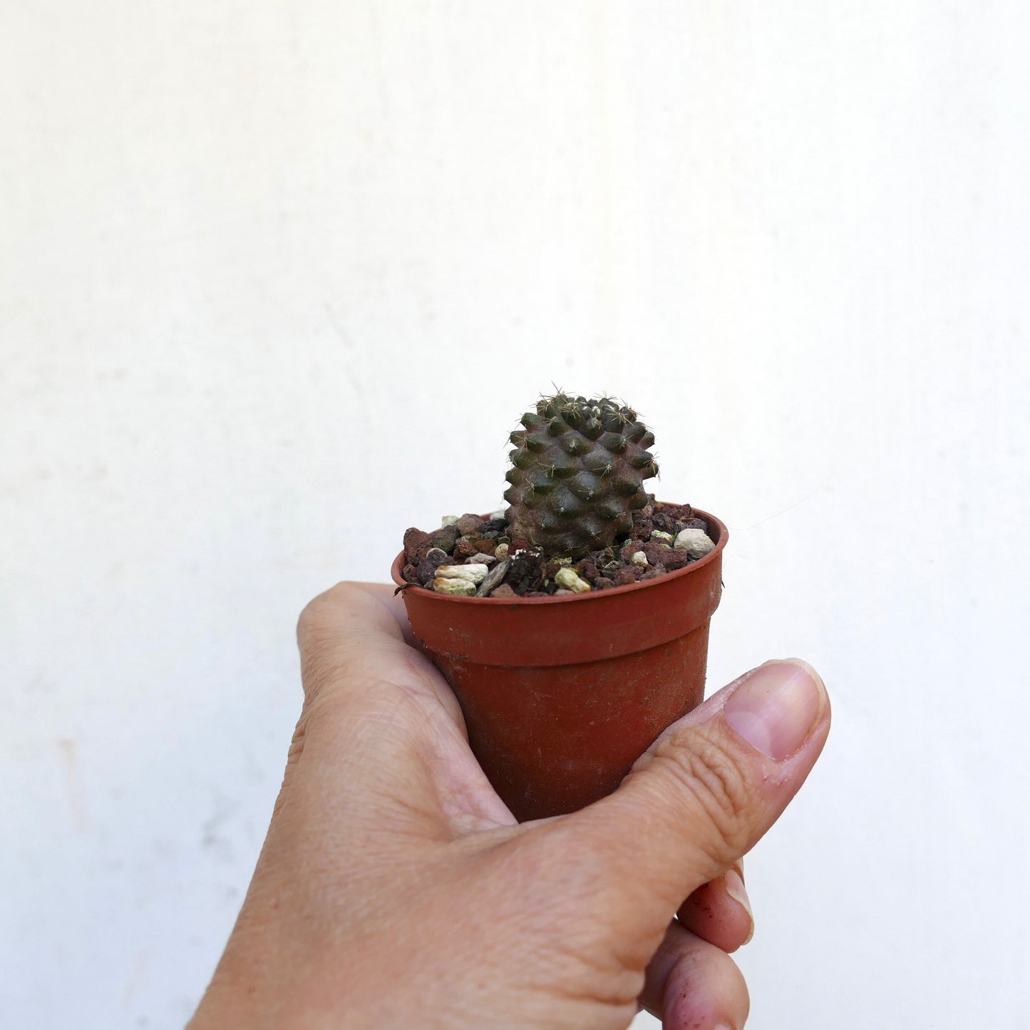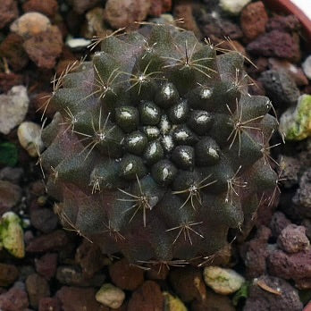 Copiapoa humilis is a small, globular cactus endemic to the coastal areas of northern Chile, particularly thriving in desert conditions. This species typically forms clusters, with individual stems reaching up to 10 cm in diameter. Its body is dark green, sometimes appearing nearly black, and it is densely covered in white wool and yellow to brown spines that are about 1-2 cm long. Copiapoa humilis blooms with bright yellow flowers from the crown of the plant during the spring and summer, providing a striking contrast to its darker, woolly appearance