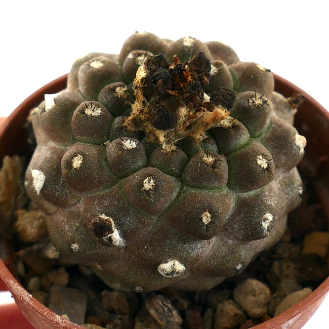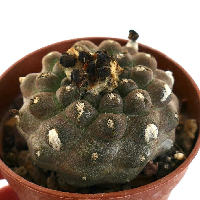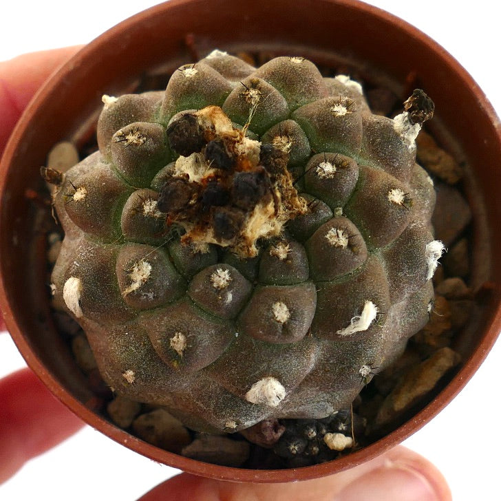It comprises 32 morphologically defined species and 5 heterotypic subspecies. The species in the genus Copiapoa forms dense cushions of hundreds of large individual plants or produce only solitary plants. The shoots are spherical or elongated-cylindrical. The spines, which are usually present, are variably shaped. On the apex, the species are usually densely woolly-haired. The ribs are clearly developed. These species vary in form from spherical to slightly columnar and in colour from a brownish to blue-green body. They have warty ribs and spiny areolas, and they usually produce tubular yellow flowers which grow from woolly crowns on the apex in summer. They are bell- to funnel-shaped and open during the day. The short, circular pericarp is glabrous. The flower tube is short and broad. The small, smooth fruits contain large, shiny black seeds.