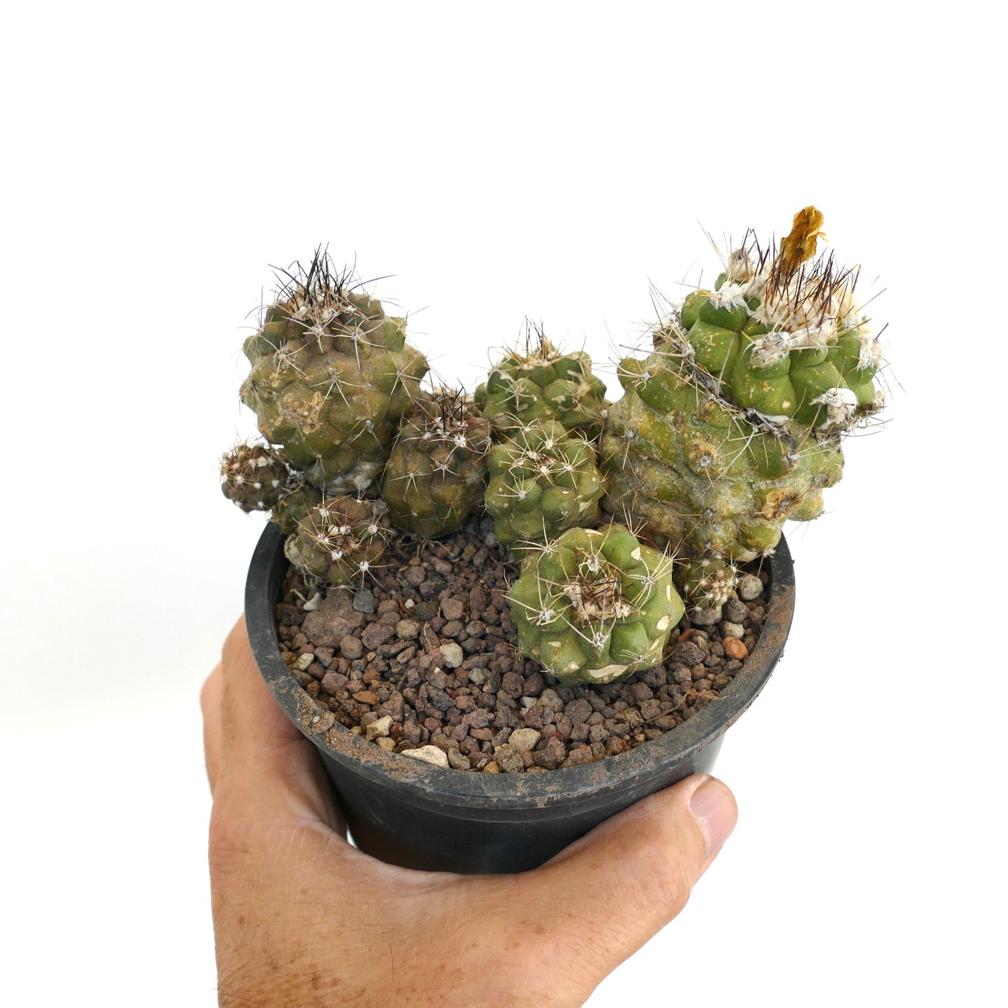 The Copiapoa rarissima is an exceptionally rare and striking cactus native to the arid regions of northern Chile. This plant features globular stems that are a distinctive chalky white to bluish-gray, forming dense, compact clusters. The ribs are prominent with well-defined tubercles. Its spines are short, black or dark brown, and robust, providing a dramatic contrast against the pale stem color. In summer, it produces small, funnel-shaped yellow flowers that emerge from the crown of the stems, adding a splash of color to its otherwise muted appearance.
