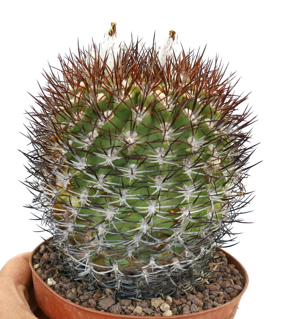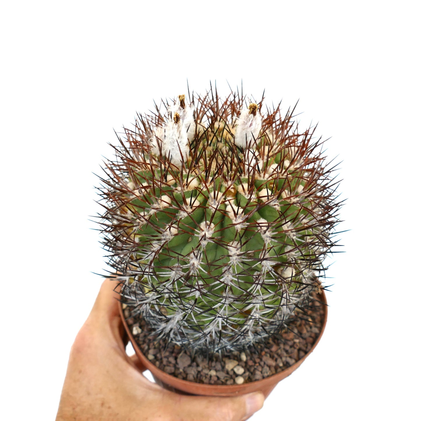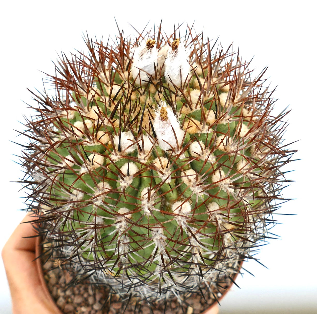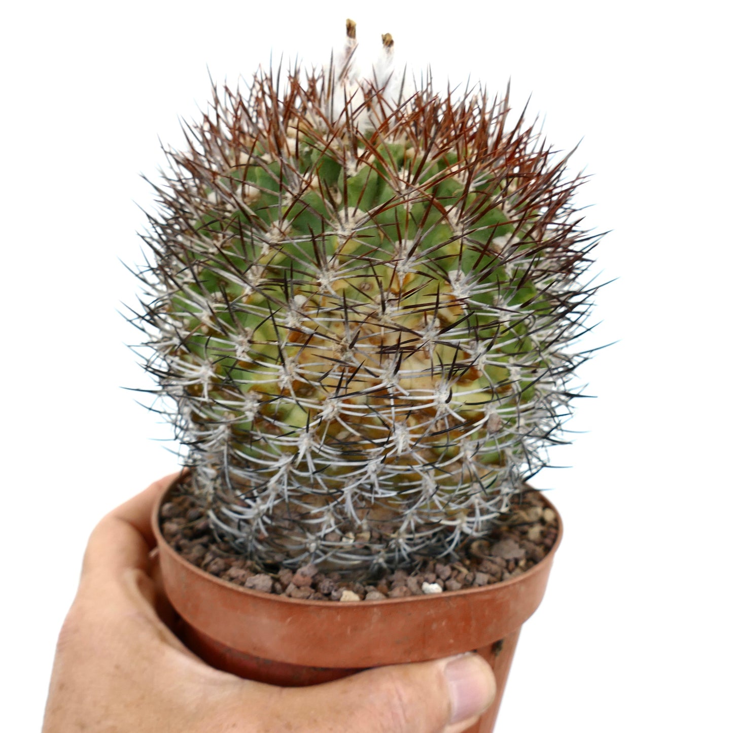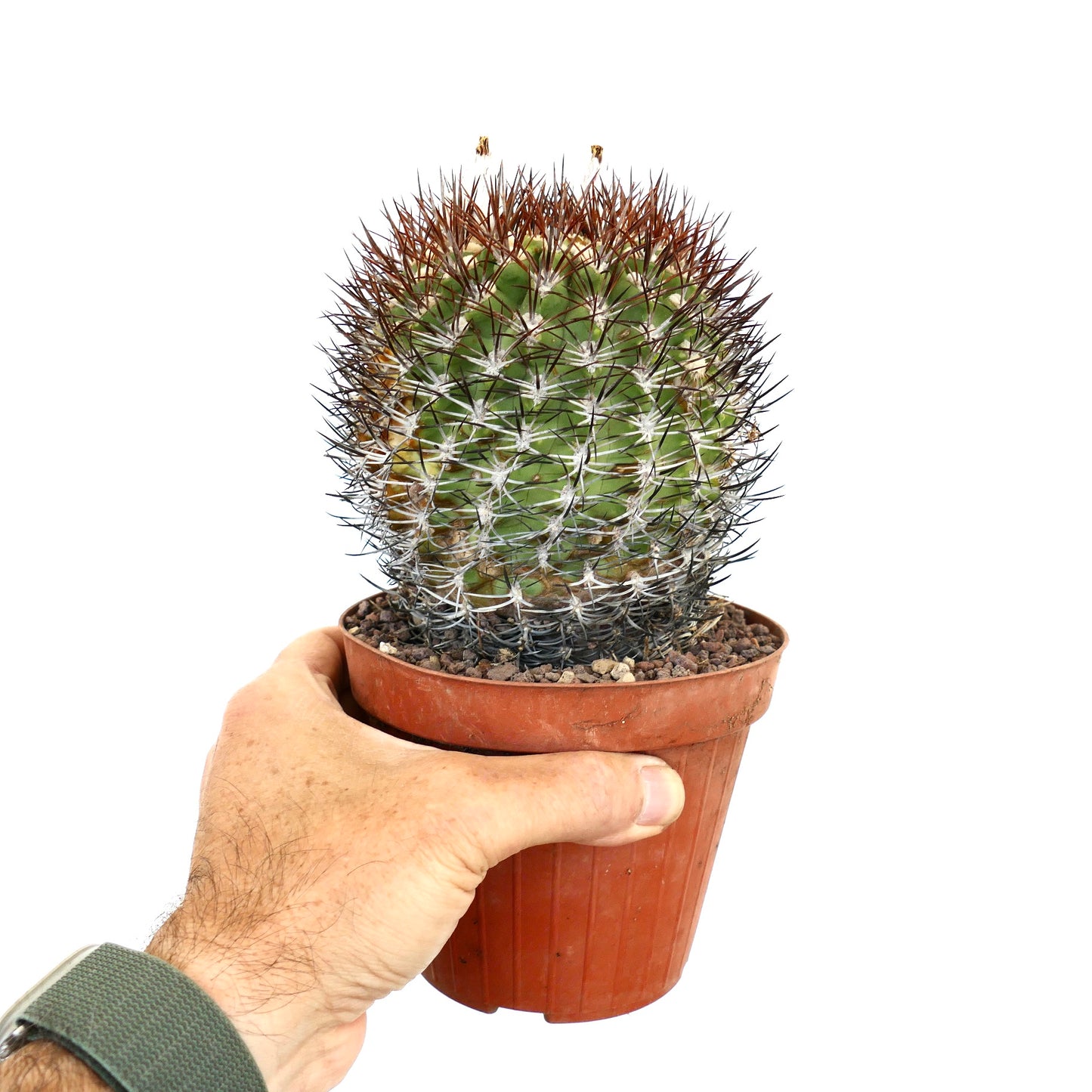 Eriosyce ceratistes ssp. combarbalensis is a distinctive cactus known for its globular to short cylindrical shape and textured, tuberculate surface. The stems are typically dark green to grayish-brown, covered with prominent, conical tubercles that give the plant a rugged appearance. This subspecies features short, robust spines that are black to dark brown. In spring to summer, it produces large, bright pink to magenta flowers that bloom from the apex, creating a stunning contrast against the darker body. Native to the arid regions of Chile, it is well-suited for rock gardens, containers, and succulent collections.