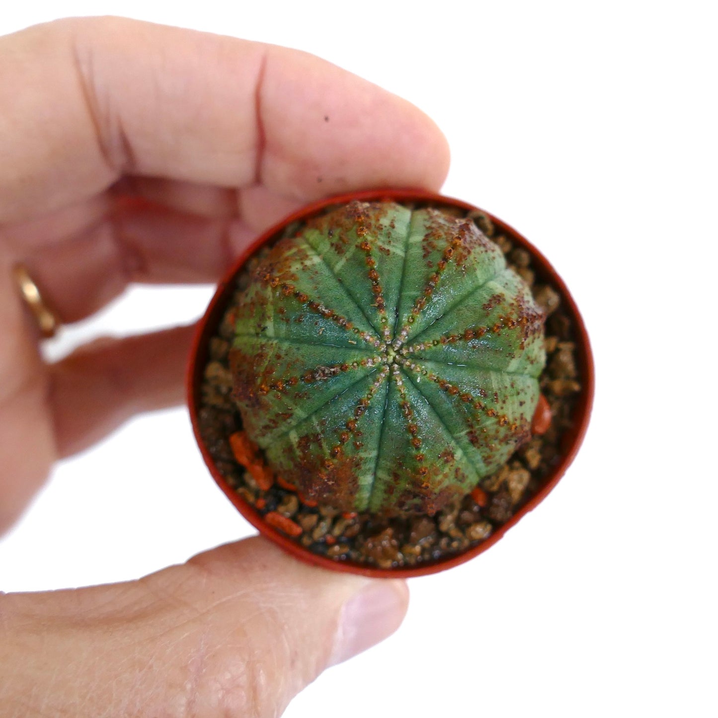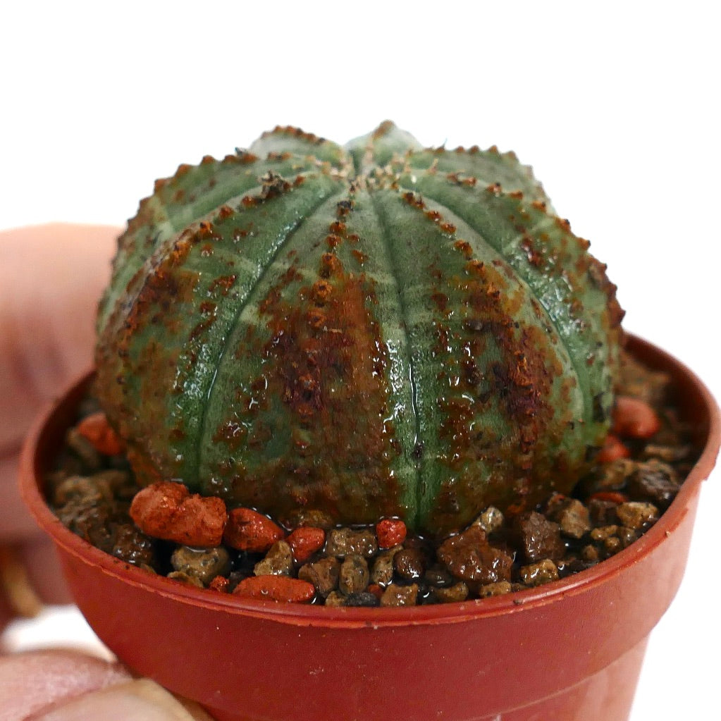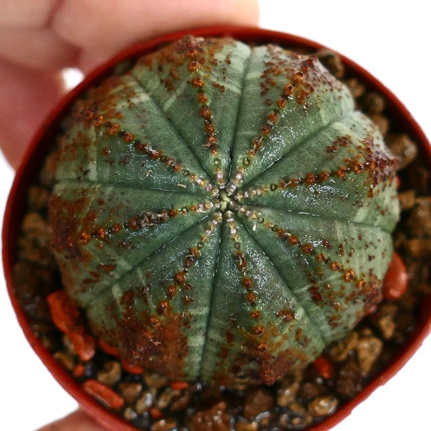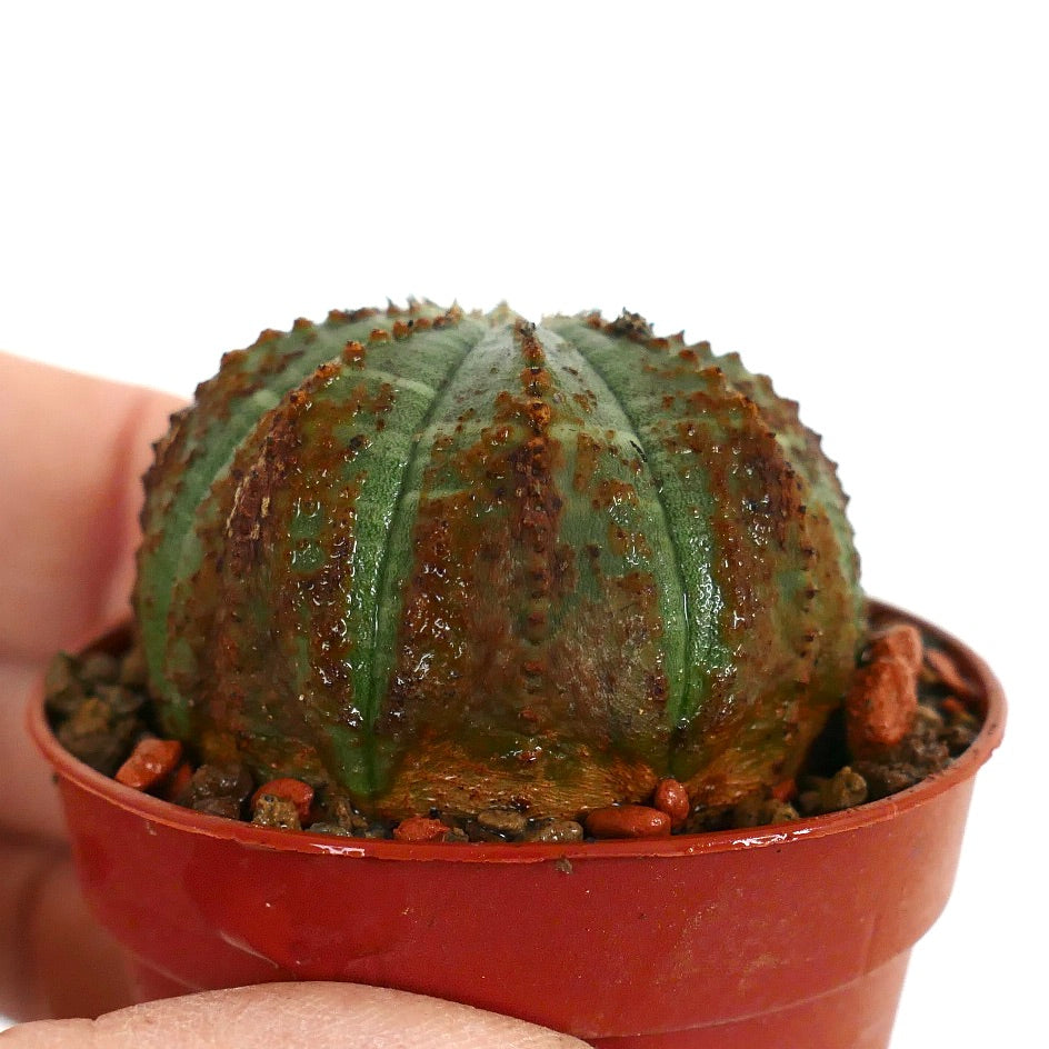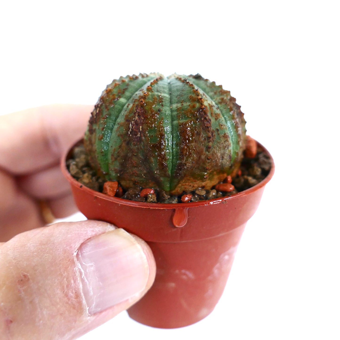 Euphorbia obesa is a captivating South African succulent known for its distinctive spherical shape. This variety features intriguing brown arrows marks & dots that create a unique dotted pattern across its surface. Often called the baseball plant, its round, ball-like form resembles a miniature globe, making it a remarkable addition to any collection of succulents.