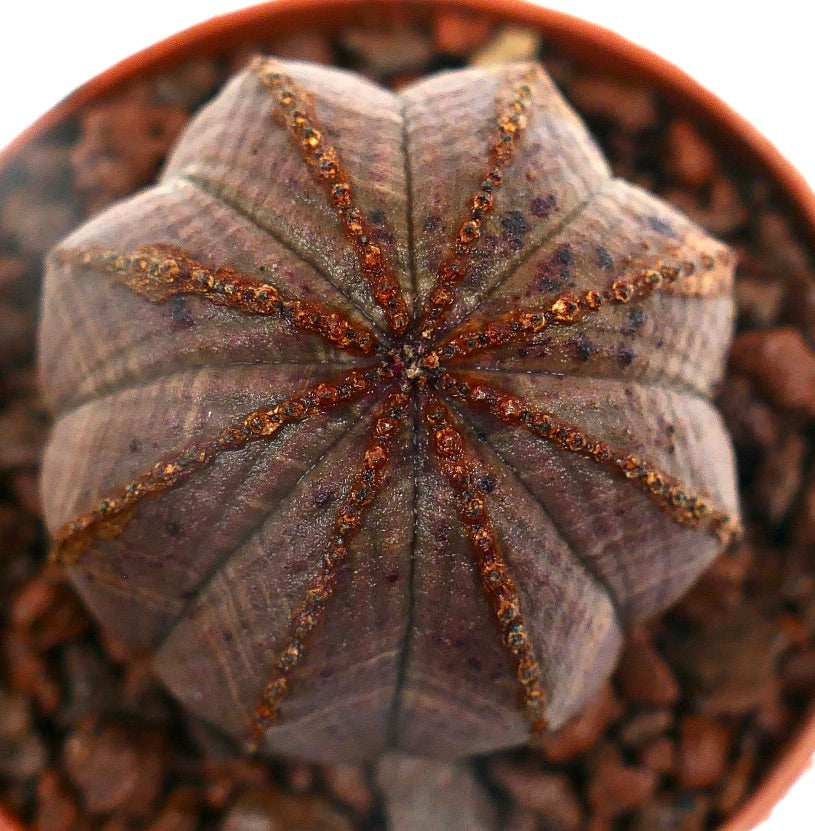 The Euphorbia obesa gray-pinkish variation stands out with its delicate blend of gray and soft pink hues. This rare color morph enhances its ornamental appeal and adds a gentle warmth to its appearance. The plant’s symmetry and compact growth make it a striking addition to any collection, highlighting the beauty of round succulents in a subtle, elegant way.
