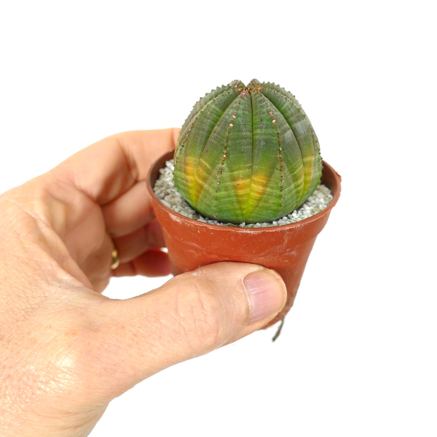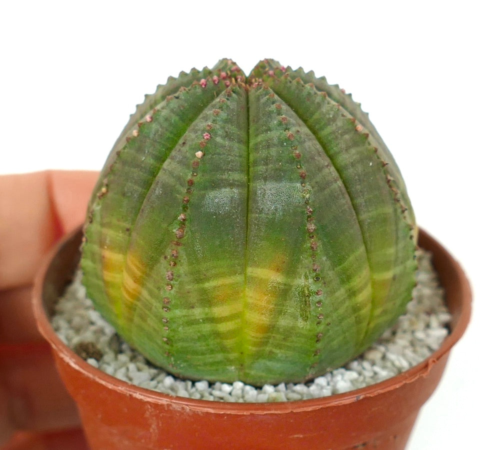 Euphorbia obesa GREEN with YELLOW AREAS is a fascinating succulent belonging to the Euphorbiaceae family. Native to South Africa, this unique plant displays a spherical, ribbed stem that develops attractive green coloration with distinct yellow areas. Lacking spines, it's often mistaken for a cactus. Euphorbia obesa is dioecious, meaning individual plants have either male or female flowers.