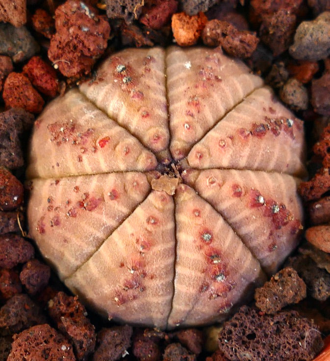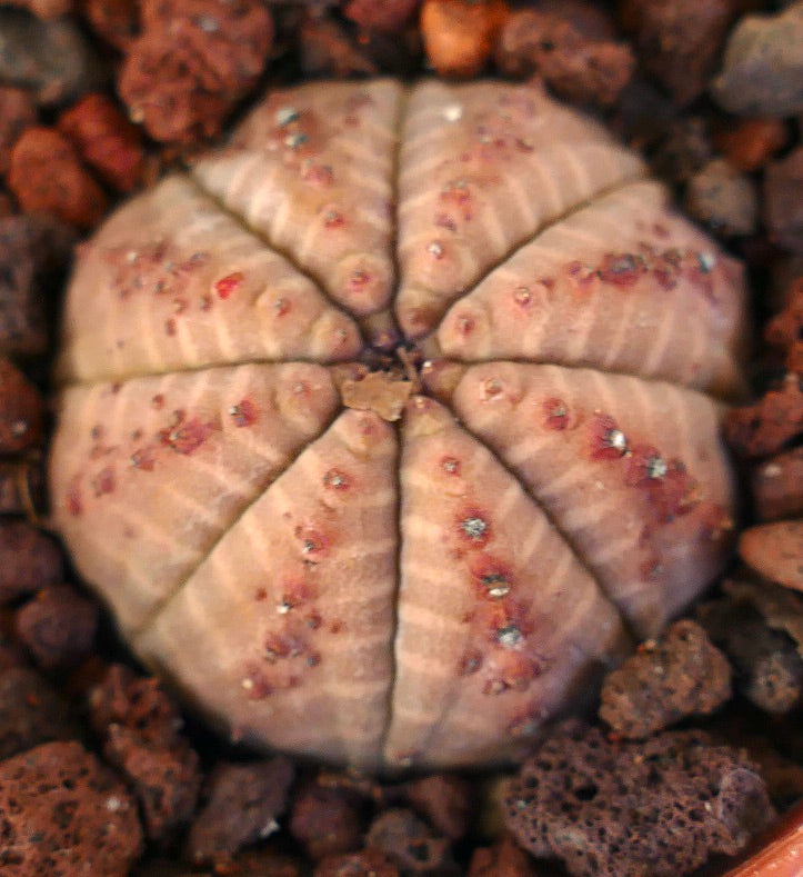 Euphorbia obesa, also known as the baseball plant, is a spherical succulent native to South Africa. It grows up to 8 inches in height and 3.5 inches in diameter, with a distinctive globular shape and green-gray coloration, often marked with faint horizontal bands. The plant is dioecious, with separate male and female plants, and produces small, inconspicuous yellow-green flowers at the top of the stem. Its unique appearance and easy-care nature make it a popular choice for succulent enthusiasts.