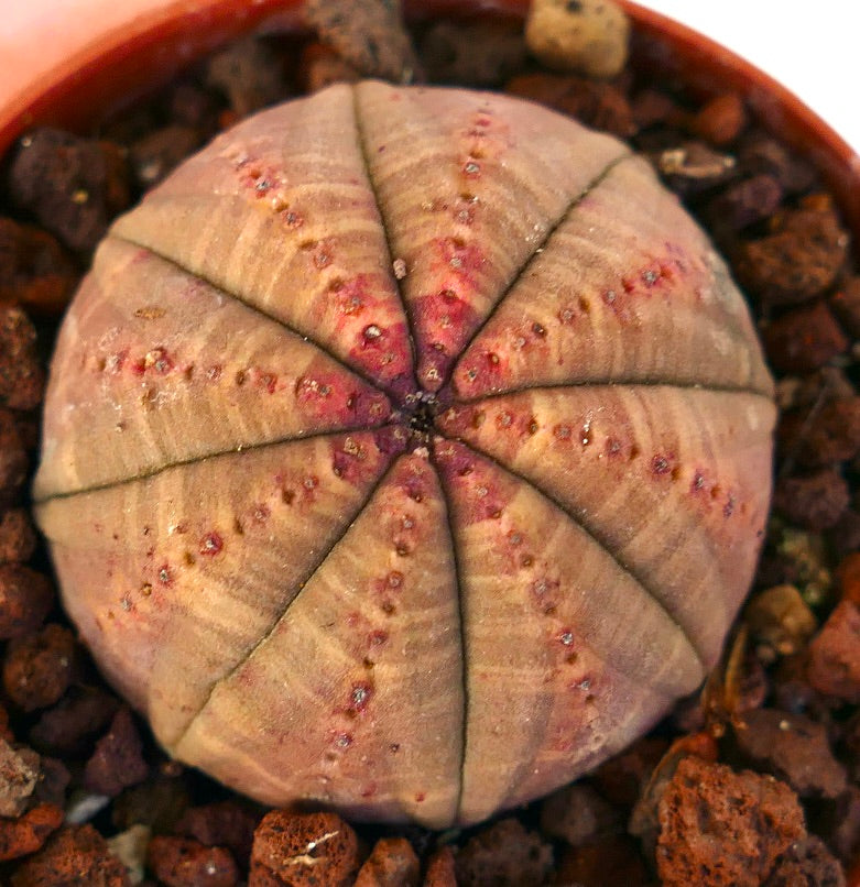 Euphorbia obesa, also known as the baseball plant, is a spherical succulent native to South Africa. It grows up to 8 inches in height and 3.5 inches in diameter, with a distinctive globular shape and green-gray coloration, often marked with faint horizontal bands. The plant is dioecious, with separate male and female plants, and produces small, inconspicuous yellow-green flowers at the top of the stem. Its unique appearance and easy-care nature make it a popular choice for succulent enthusiasts.